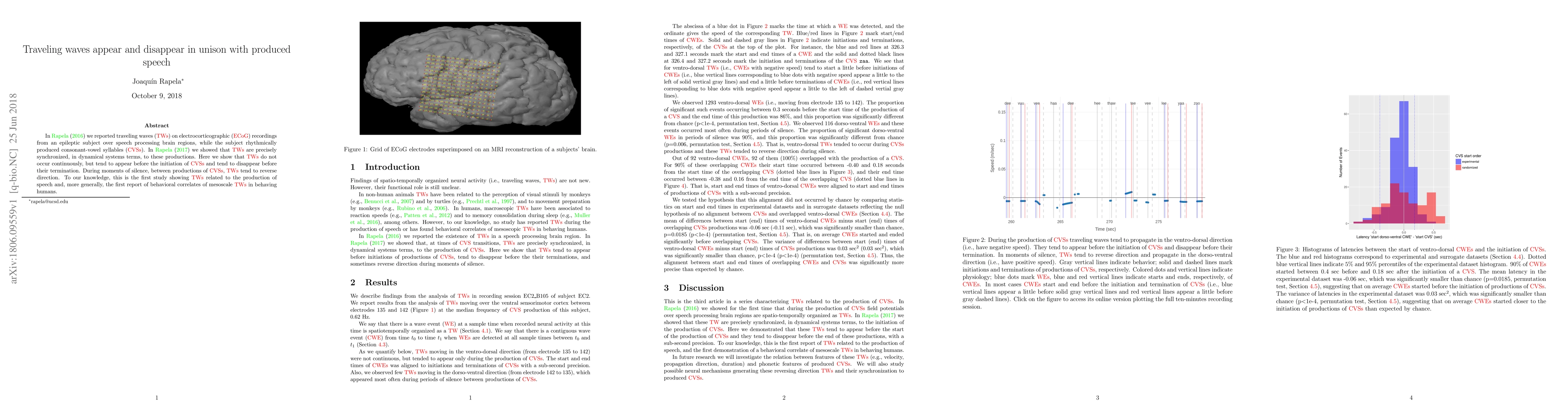 In Rapela (2016) we reported traveling waves (TWs) on electrocorticographic (ECoG) recordings from an epileptic subject over speech processing brain regions, while the subject rhythmically produced consonant-vowel syllables (CVSs). In Rapela (2017) we showed that TWs are precisely synchronized, in dynamical systems terms, to these productions. Here we show that TWs do not occur continuously, but tend to appear before the initiation of CVSs and tend to disappear before their termination. During moments of silence, between productions of CVSs, TWs tend to reverse direction. To our knowledge, this is the first study showing TWs related to the production of speech and, more generally, the first report of behavioral correlates of mesoscale TWs in behaving humans.