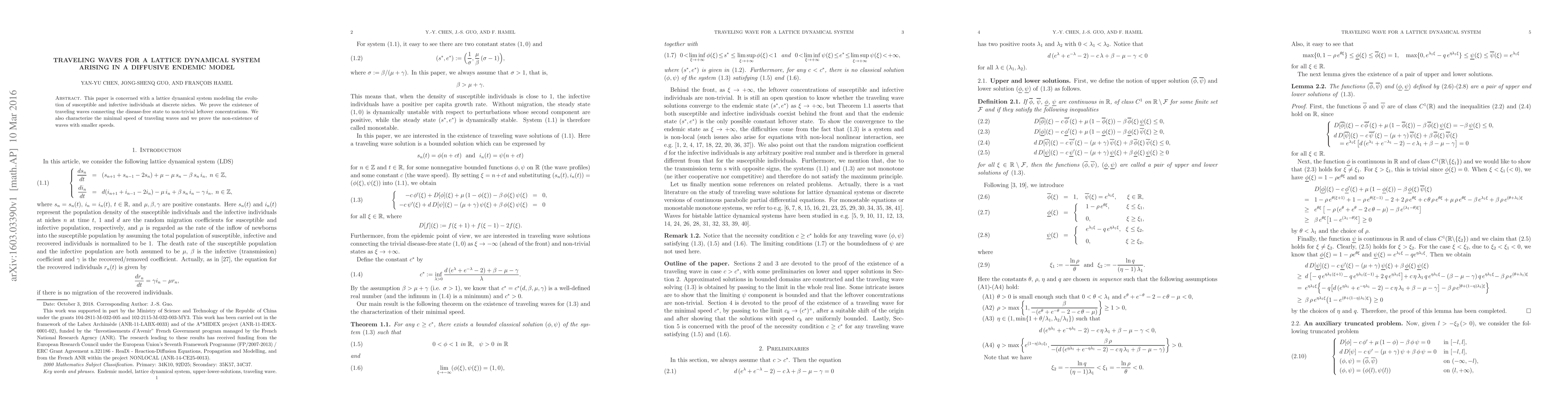 This paper is concerned with a lattice dynamical system modeling the evolution of susceptible and infective individuals at discrete niches. We prove the existence of traveling waves connecting the disease-free state to non-trivial leftover concentrations. We also characterize the minimal speed of traveling waves and we prove the non-existence of waves with smaller speeds.