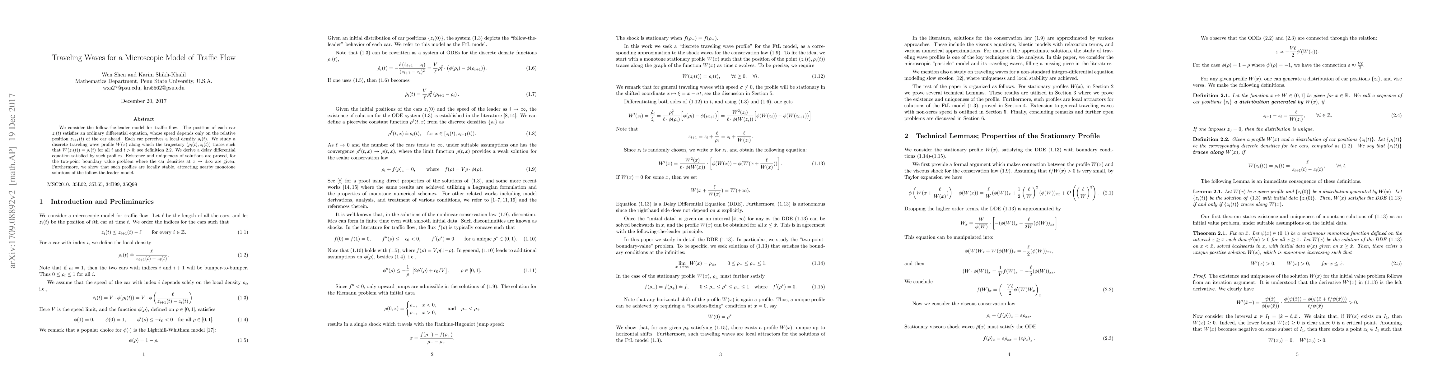 This paper studies a microscopic model of traffic flow using the follow-the-leader approach, deriving a delay differential equation for discrete traveling wave profiles. It proves the existence, uniqueness, and local stability of these profiles, which attract nearby monotone solutions.