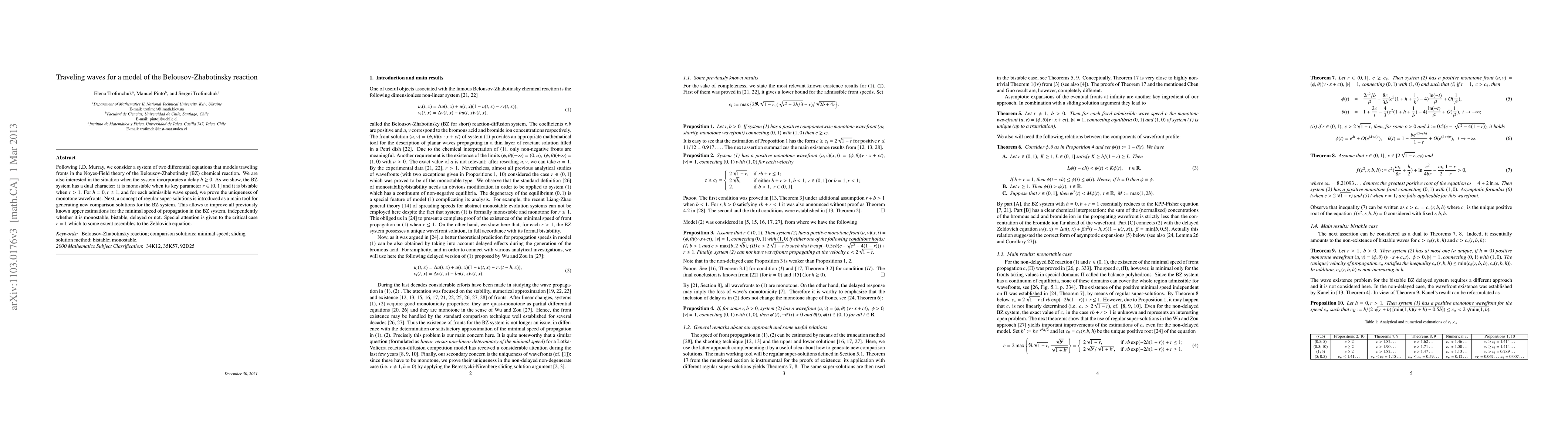 Following J.D. Murray, we consider a system of two differential equations that models traveling fronts in the Noyes-Field theory of the Belousov-Zhabotinsky (BZ) chemical reaction. We are also interested in the situation when the system incorporates a delay $h\geq 0$. As we show, the BZ system has a dual character: it is monostable when its key parameter $r \in (0,1]$ and it is bistable when $r >1$. For $h=0, r\not=1$, and for each admissible wave speed, we prove the uniqueness of monotone wavefronts. Next, a concept of regular super-solutions is introduced as a main tool for generating new comparison solutions for the BZ system. This allows to improve all previously known upper estimations for the minimal speed of propagation in the BZ system, independently whether it is monostable, bistable, delayed or not. Special attention is given to the critical case $r=1$ which to some extent resembles to the Zeldovich equation.