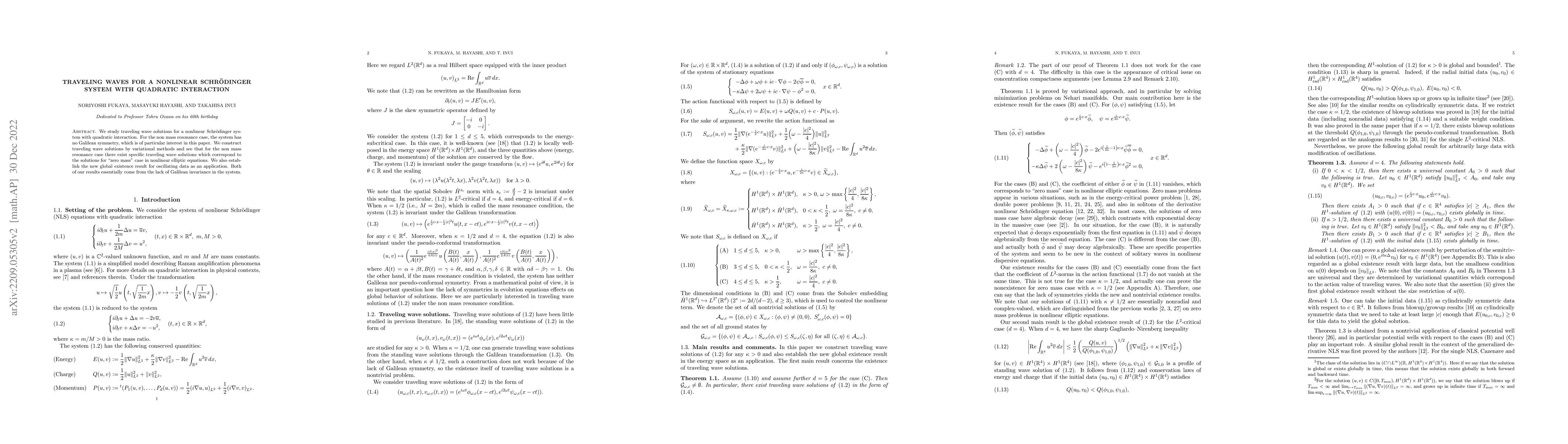 This paper investigates traveling wave solutions for a nonlinear Schrödinger system with quadratic interaction, focusing on the non-mass resonance case. It constructs these solutions using variational methods and establishes global existence for oscillating data, highlighting the unique properties arising from the system's lack of Galilean symmetry.