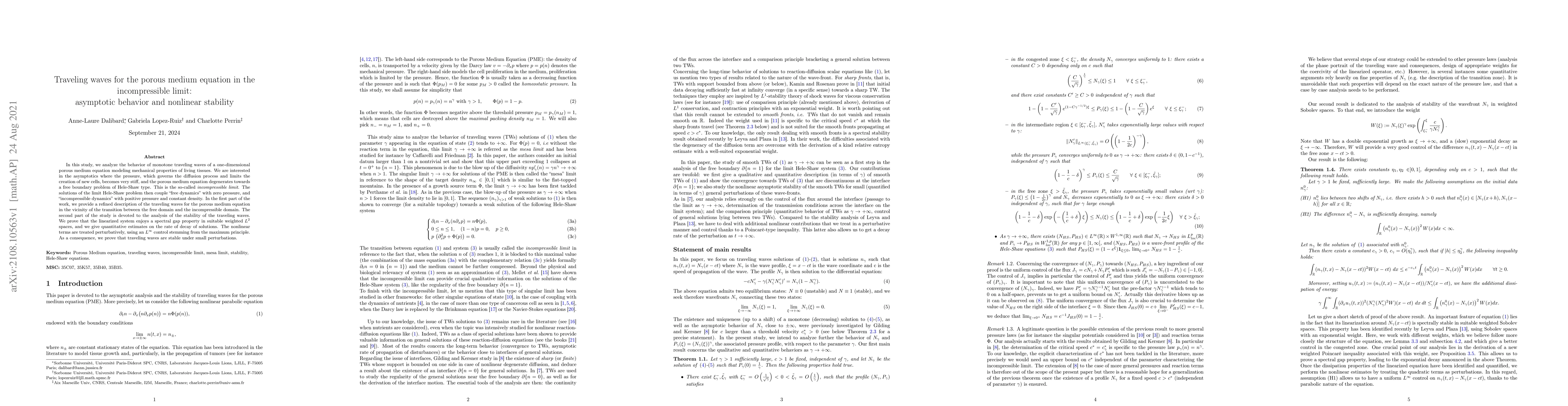 This paper investigates the asymptotic behavior and nonlinear stability of traveling waves in a one-dimensional porous medium equation under the incompressible limit, showing that these waves are stable under small perturbations through a spectral gap property and perturbative analysis.
