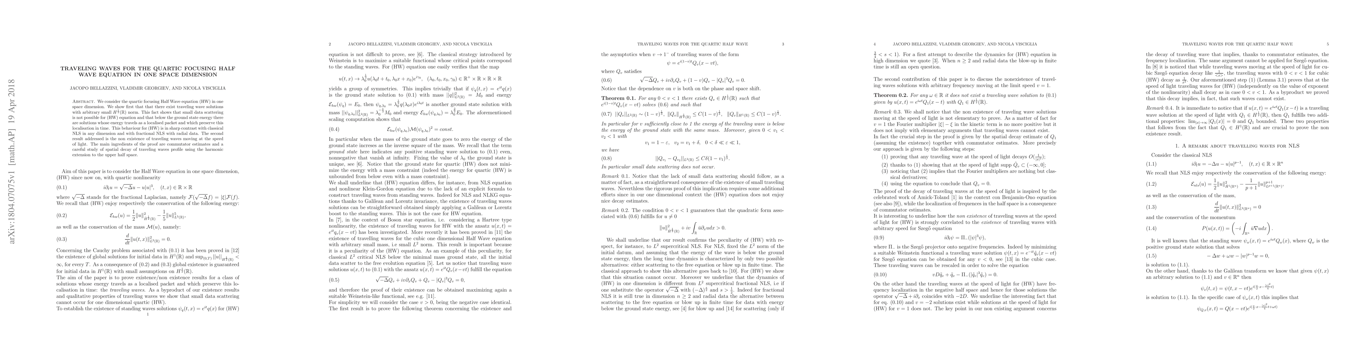 We consider the quartic focusing Half Wave equation (HW) in one space dimension. We show first that that there exist traveling wave solutions with arbitrary small $H^{\frac 12}(\R)$ norm. This fact shows that small data scattering is not possible for (HW) equation and that below the ground state energy there are solutions whose energy travels as a localised packet and which preserve this localisation in time. This behaviour for (HW) is in sharp contrast with classical NLS in any dimension and with fractional NLS with radial data. The second result addressed is the non existence of traveling waves moving at the speed of light. The main ingredients of the proof are commutator estimates and a careful study of spatial decay of traveling waves profile using the harmonic extension to the upper half space.