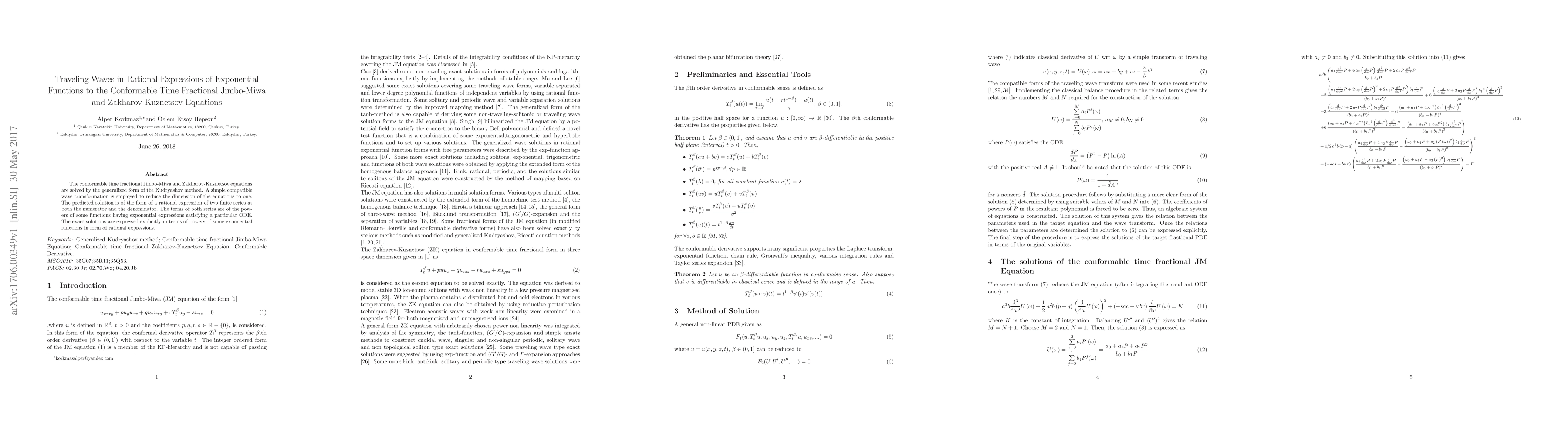 The conformable time fractional Jimbo-Miwa and Zakharov-Kuznetsov equations are solved by the generalized form of the Kudryashov method. A simple compatible wave transformation is employed to reduce the dimension of the equations to one. The predicted solution is of the form of a rational expression of two finite series at both the numerator and the denominator. The terms of both series are of the powers of some functions having exponential expressions satisfying a particular ODE. The exact solutions are expressed explicitly in terms of powers of some exponential functions in form of rational expressions.