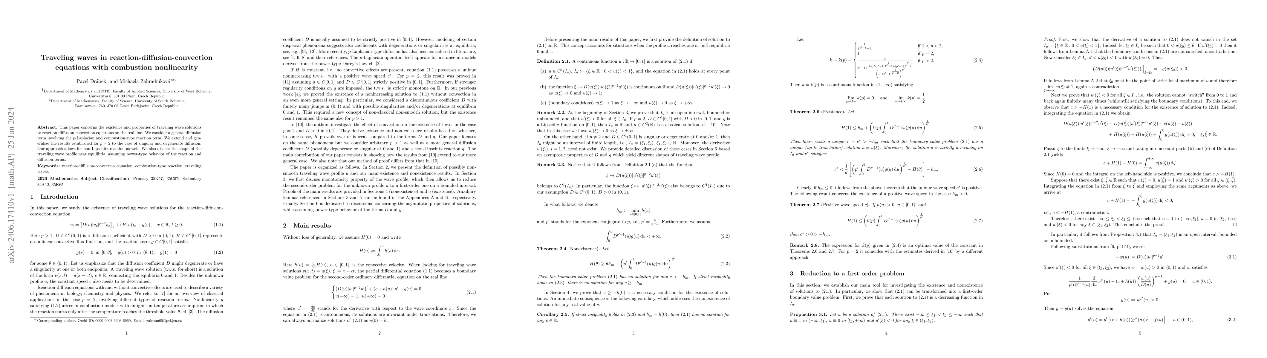 This paper concerns the existence and properties of traveling wave solutions to reaction-diffusion-convection equations on the real line. We consider a general diffusion term involving the $p$-Laplacian and combustion-type reaction term. We extend and generalize the results established for $p=2$ to the case of singular and degenerate diffusion. Our approach allows for non-Lipschitz reaction as well. We also discuss the shape of the traveling wave profile near equilibria, assuming power-type behavior of the reaction and diffusion terms.