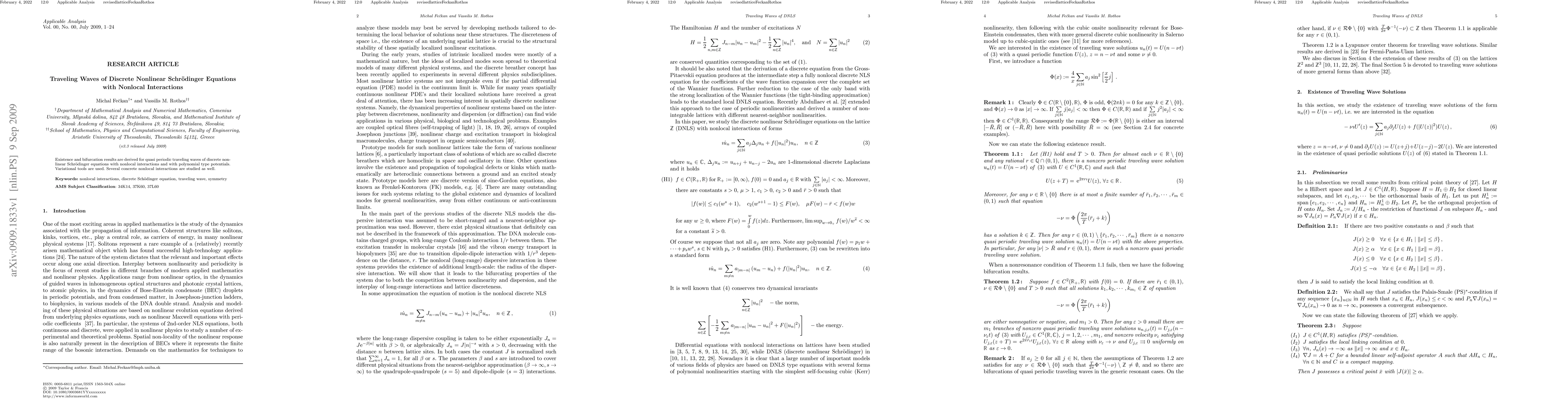 Existence and bifurcation results are derived for quasi periodic traveling waves of discrete nonlinear Schrodinger equations with nonlocal interactions and with polynomial type potentials. Variational tools are used. Several concrete nonlocal interactions are studied as well.