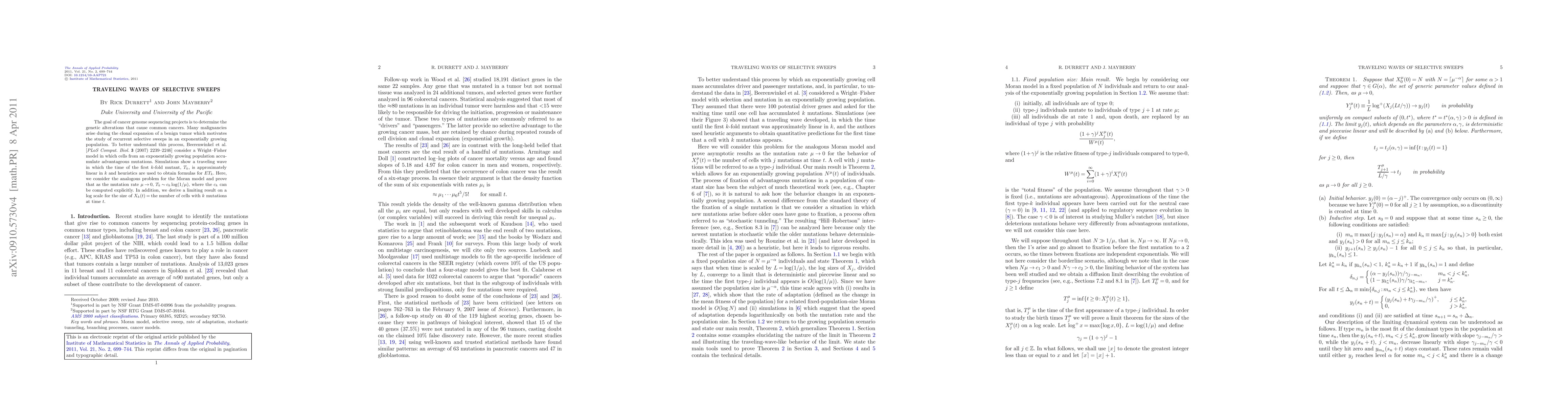 The goal of cancer genome sequencing projects is to determine the genetic alterations that cause common cancers. Many malignancies arise during the clonal expansion of a benign tumor which motivates the study of recurrent selective sweeps in an exponentially growing population. To better understand this process, Beerenwinkel et al. [PLoS Comput. Biol. 3 (2007) 2239--2246] consider a Wright--Fisher model in which cells from an exponentially growing population accumulate advantageous mutations. Simulations show a traveling wave in which the time of the first $k$-fold mutant, $T_k$, is approximately linear in $k$ and heuristics are used to obtain formulas for $ET_k$. Here, we consider the analogous problem for the Moran model and prove that as the mutation rate $\mu\to0$, $T_k\sim c_k\log(1/\mu)$, where the $c_k$ can be computed explicitly. In addition, we derive a limiting result on a log scale for the size of $X_k(t)={}$the number of cells with $k$ mutations at time $t$.