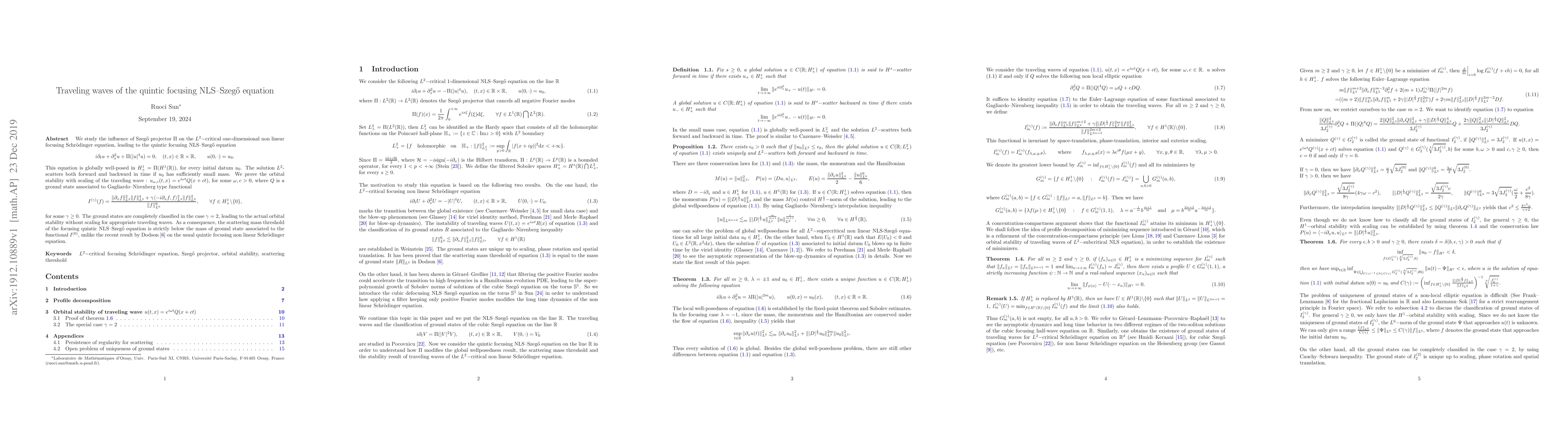 We study the influence of Szeg{\"o} projector $\Pi$ on the L 2 --critical one-dimensional non linear focusing Schr{\"o}dinger equation, leading to the quintic focusing NLS-Szeg{\"o} equation i$\partial$ t u + $\partial$ 2 x u + $\Pi$(|u| 4 u) = 0, (t, x) $\in$ R x R, u(0, $\times$) = u 0. This equation is globally well-posed in H 1 + = $\Pi$(H 1 (R)), for every initial datum u 0. The solution L 2-scatters both forward and backward in time if u 0 has sufficiently small mass. We prove the orbital stability with scaling of the traveling wave : u $\omega$,c (t, x) = e i$\omega$t Q(x + ct), for some $\omega$, c > 0, where Q is a ground state associated to Gagliardo-Nirenberg type functional I ($\gamma$) (f) = $\partial$ x f 2 L 2 f 4 L 2 + $\gamma$ --i$\partial$ x f, f 2 L 2 f 2 L 2 f 6 L 6 , $\forall$f $\in$ H 1 + \{0}, for some $\gamma$ $\ge$ 0. The ground states are completely classified in the case $\gamma$ = 2, leading to the actual orbital stability without scaling for appropriate traveling waves. As a consequence, the scattering mass threshold of the focusing quintic NLS-Szeg{\"o} equation is strictly below the mass of ground state associated to the functional I (0) , unlike the recent result by Dodson [6] on the usual quintic focusing non linear Schr{\"o}dinger equation.