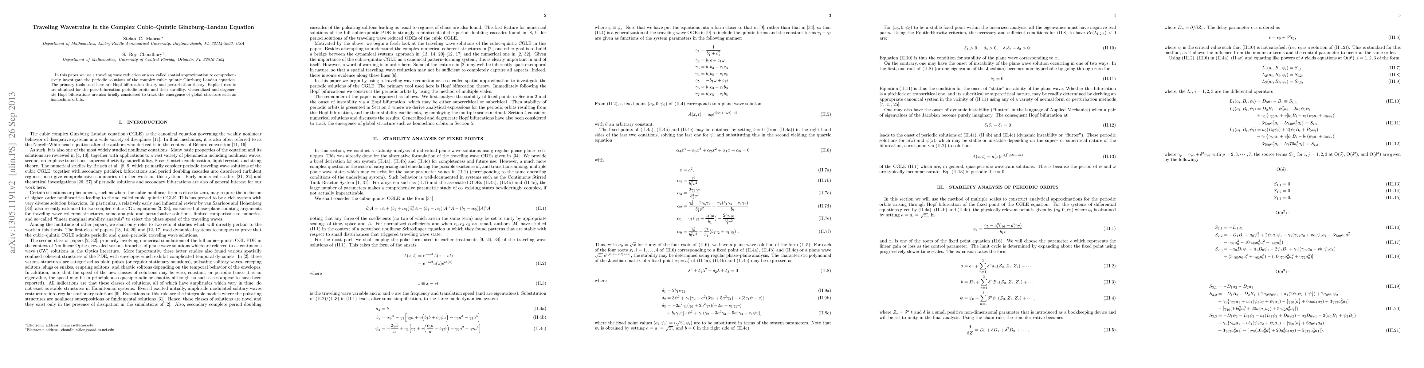 In this paper we use a traveling wave reduction or a so-called spatial approximation to comprehensively investigate the periodic solutions of the complex cubic-quintic Ginzburg-Landau equation. The primary tools used here are Hopf bifurcation theory and perturbation theory. Explicit results are obtained for the post-bifurcation periodic orbits and their stability. Generalized and degenerate Hopf bifurcations are also briefly considered to track the emergence of global structure such as homoclinic orbits.