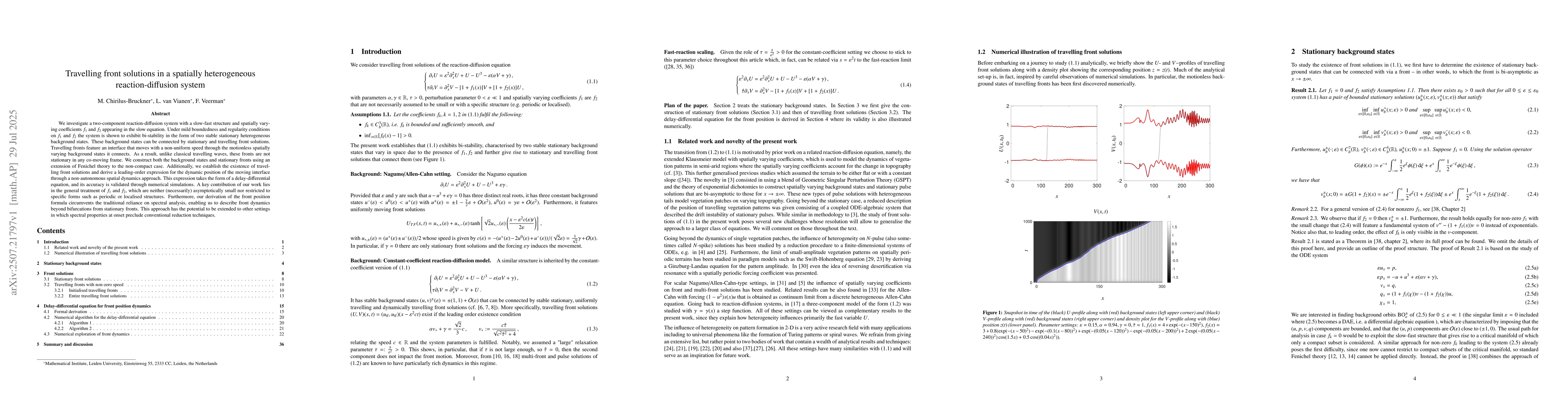 We investigate a two-component reaction-diffusion system with a slow-fast structure and spatially varying coefficients $ f_1 $ and $ f_2 $ appearing in the slow equation. Under mild boundedness and regularity conditions on $ f_1 $ and $ f_2 $ the system is shown to exhibit bi-stability in the form of two stable stationary heterogeneous background states. These background states can be connected by stationary and travelling front solutions. Travelling fronts feature an interface that moves with a non-uniform speed through the motionless spatially varying background states it connects. As a result, unlike classical travelling waves, these fronts are not stationary in any co-moving frame. We construct both the background states and stationary fronts using an extension of Fenichel theory to the non-compact case. Additionally, we establish the existence of travelling front solutions and derive a leading-order expression for the dynamic position of the moving interface through a non-autonomous spatial dynamics approach. This expression takes the form of a delay-differential equation, and its accuracy is validated through numerical simulations. A key contribution of our work lies in the general treatment of $ f_1 $ and $ f_2 $, which are neither (necessarily) asymptotically small nor restricted to specific forms such as periodic or localised structures. Furthermore, our derivation of the front position formula circumvents the traditional reliance on spectral analysis, enabling us to describe front dynamics beyond bifurcations from stationary fronts. This approach has the potential to be extended to other settings in which spectral properties at onset preclude conventional reduction techniques.