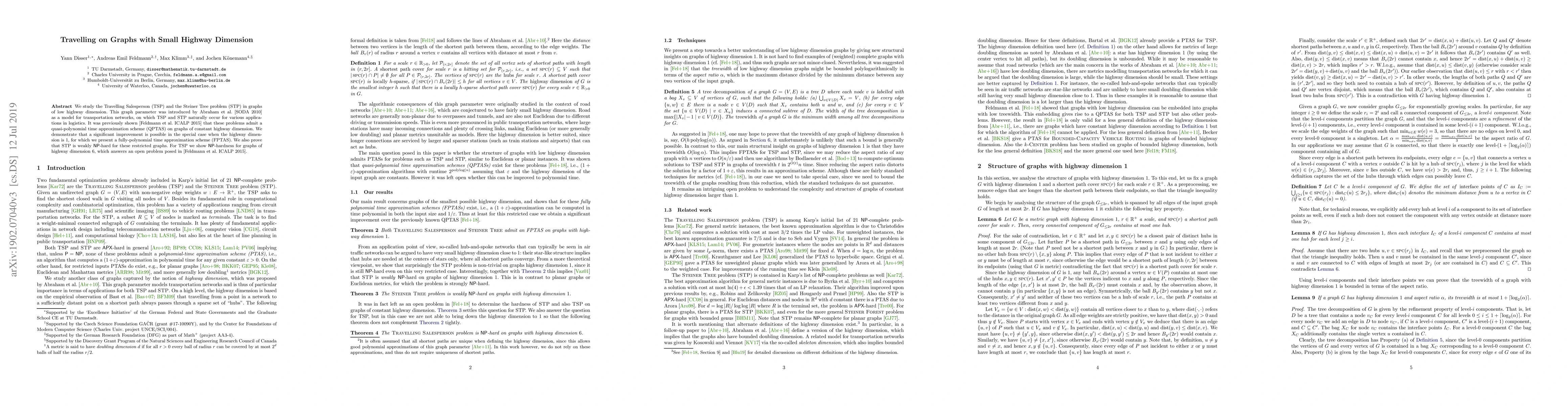 This paper investigates the Travelling Salesperson and Steiner Tree problems in graphs with low highway dimension, showing that an FPTAS exists for highway dimension 1, while proving NP-hardness for TSP in graphs with highway dimension 6 and weakly NP-hardness for STP.