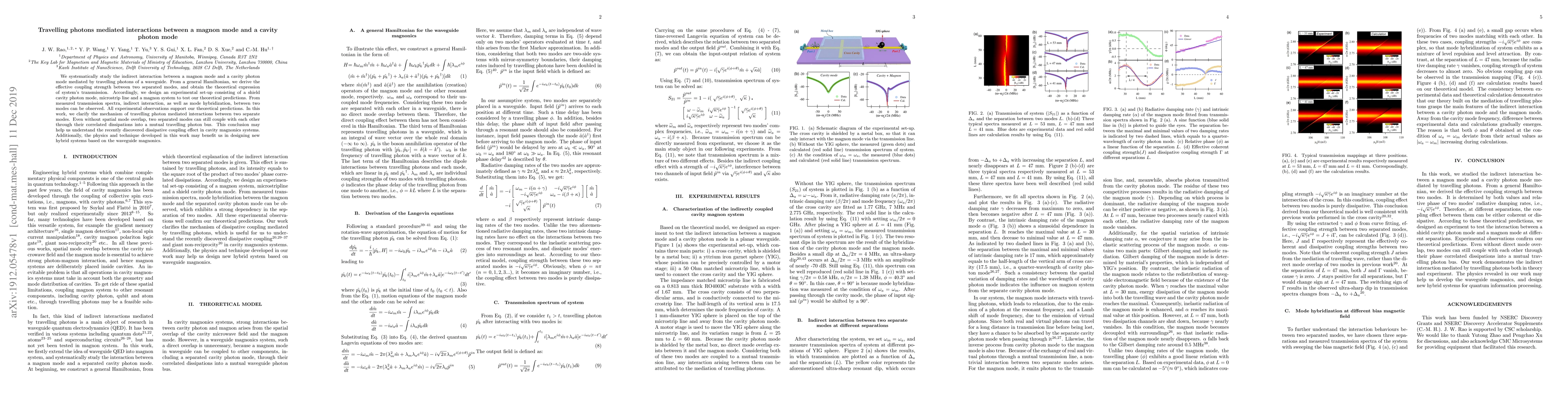 We systematically study the indirect interaction between a magnon mode and a cavity photon mode mediated by travelling photons of a waveguide. From a general Hamiltonian, we derive the effective coupling strength between two separated modes, and obtain the theoretical expression of system's transmission. Accordingly, we design an experimental set-up consisting of a shield cavity photon mode, microstrip line and a magnon system to test our theoretical predictions. From measured transmission spectra, indirect interaction, as well as mode hybridization, between two modes can be observed. All experimental observations support our theoretical predictions. In this work, we clarify the mechanism of travelling photon mediated interactions between two separate modes. Even without spatial mode overlap, two separated modes can still couple with each other through their correlated dissipations into a mutual travelling photon bus. This conclusion may help us understand the recently discovered dissipative coupling effect in cavity magnonics systems. Additionally, the physics and technique developed in this work may benefit us in designing new hybrid systems based on the waveguide magnonics.