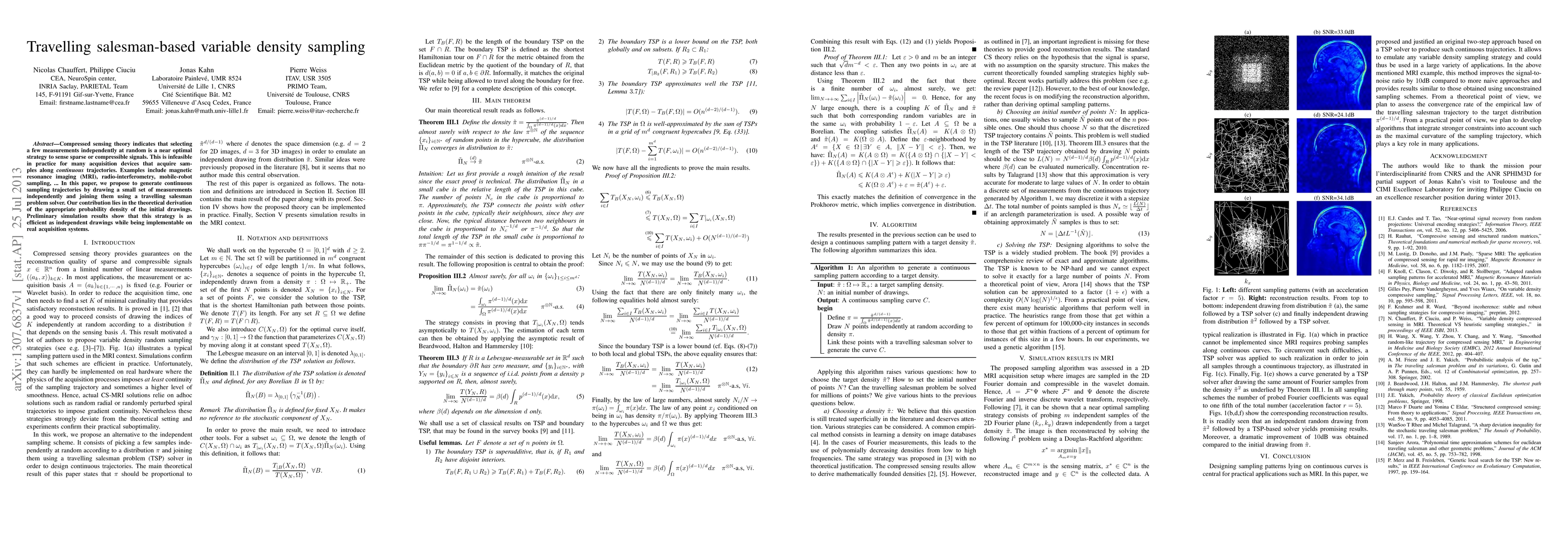 Compressed sensing theory indicates that selecting a few measurements independently at random is a near optimal strategy to sense sparse or compressible signals. This is infeasible in practice for many acquisition devices that acquire sam- ples along continuous trajectories. Examples include magnetic resonance imaging (MRI), radio-interferometry, mobile-robot sampling, ... In this paper, we propose to generate continuous sampling trajectories by drawing a small set of measurements independently and joining them using a travelling salesman problem solver. Our contribution lies in the theoretical derivation of the appropriate probability density of the initial drawings. Preliminary simulation results show that this strategy is as efficient as independent drawings while being implementable on real acquisition systems.