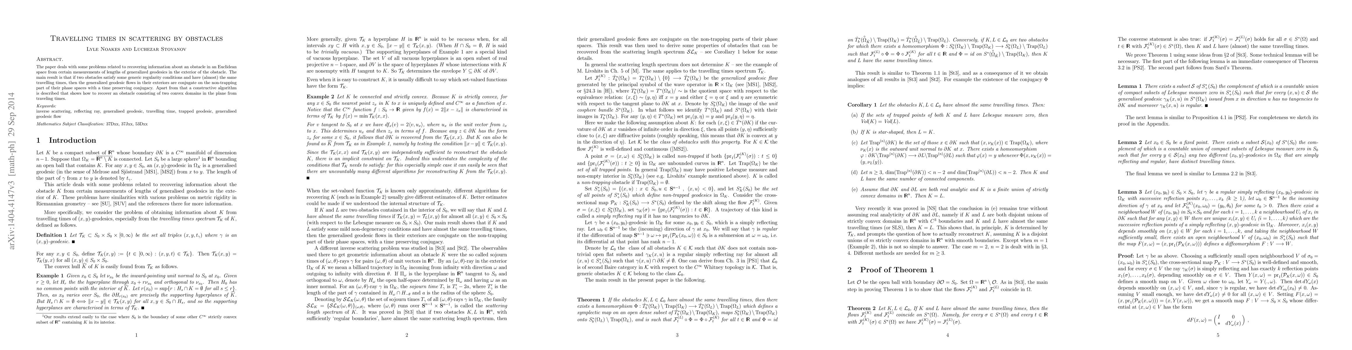 The paper deals with some problems related to recovering information about an obstacle in an Euclidean space from certain measurements of lengths of generalized geodesics in the exterior of the obstacle. The main result is that if two obstacles satisfy some generic regularity conditions and have (almost) the same traveling times, then the generalized geodesic flows in their exteriors are conjugate on the non-trapping part of their phase spaces with a time preserving conjugacy. In the case of a union of two strictly convex domains in the plane, a constructive algorithm is described to recover the obstacle from traveling times.
