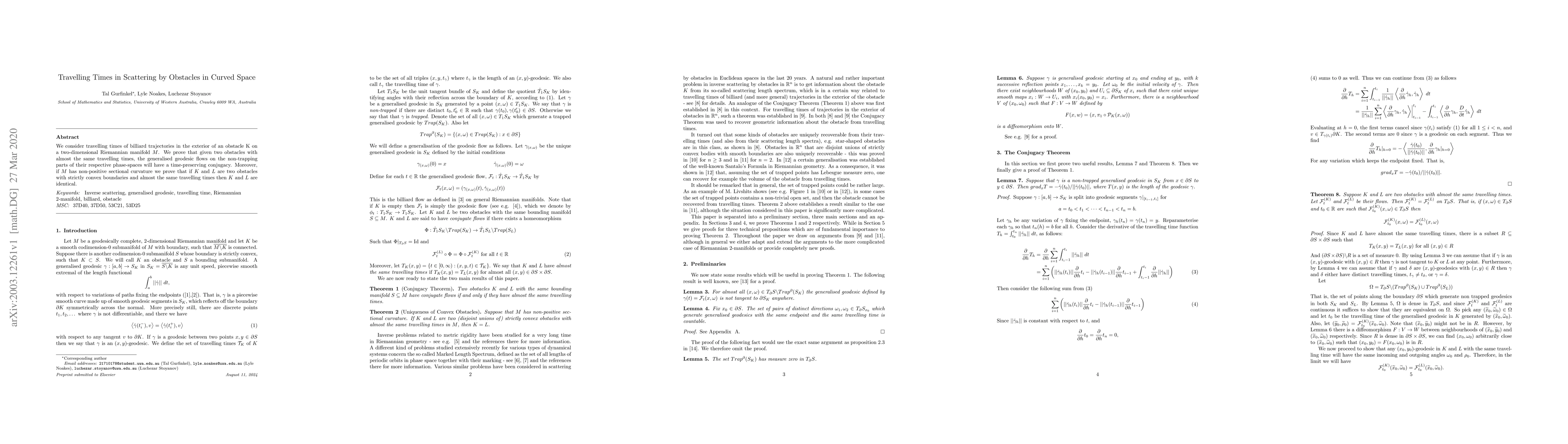 We consider travelling times of billiard trajectories in the exterior of an obstacle K on a two-dimensional Riemannian manifold M. We prove that given two obstacles with almost the same travelling times, the generalised geodesic flows on the non-trapping parts of their respective phase-spaces will have a time-preserving conjugacy. Moreover, if M has non-positive sectional curvature we prove that if K and L are two obstacles with strictly convex boundaries and almost the same travelling times then K and L are identical.