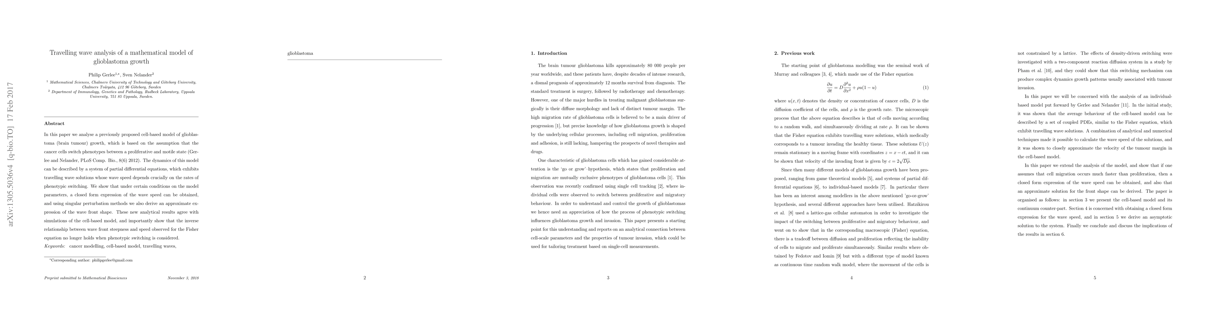 This paper analyses a mathematical model for glioblastoma growth based on cell phenotype switching, deriving travelling wave solutions and showing that wave speed depends on switching rates. Analytical results reveal a departure from the inverse wave speed-steepness relationship observed in the Fisher equation.