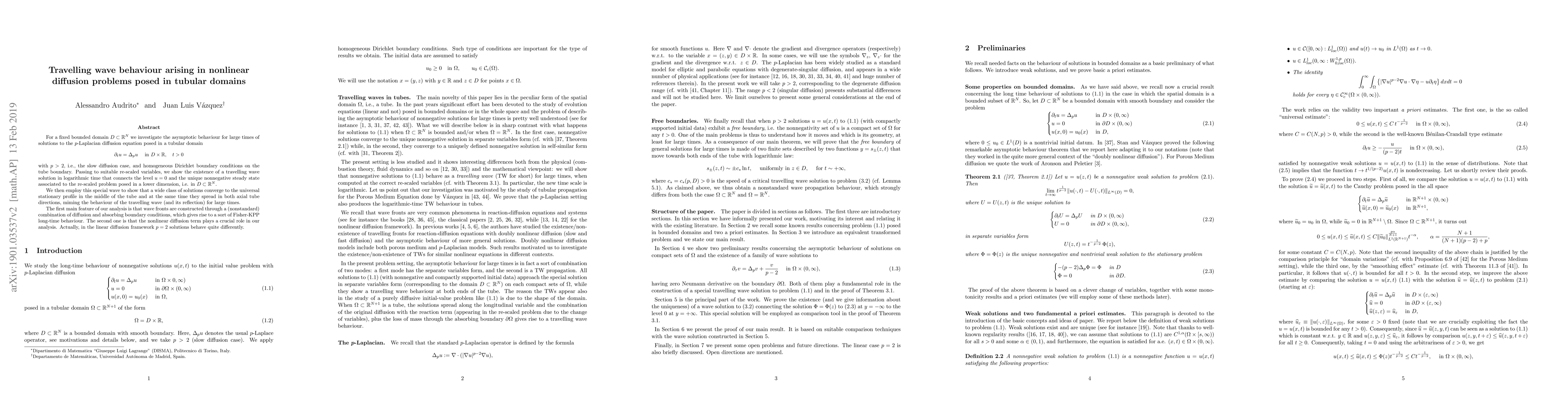 For a fixed bounded domain $D \subset \mathbb{R}^N$ we investigate the asymptotic behaviour for large times of solutions to the $p$-Laplacian diffusion equation posed in a tubular domain \begin{equation*} \partial_t u = \Delta_p u \quad \text{ in } D \times \mathbb{R}, \quad t > 0 \end{equation*} with $p>2$, i.e., the slow diffusion case, and homogeneous Dirichlet boundary conditions on the tube boundary. Passing to suitable re-scaled variables, we show the existence of a travelling wave solution in logarithmic time that connects the level $u = 0$ and the unique nonnegative steady state associated to the re-scaled problem posed in a lower dimension, i.e. in $D\subset \mathbb{R}^N$. We then employ this special wave to show that a wide class of solutions converge to the universal stationary profile in the middle of the tube and at the same time they spread in both axial tube directions, miming the behaviour of the travelling wave (and its reflection) for large times. The first main feature of our analysis is that wave fronts are constructed through a (nonstandard) combination of diffusion and absorbing boundary conditions, which gives rise to a sort of Fisher-KPP long-time behaviour. The second one is that the nonlinear diffusion term plays a crucial role in our analysis. Actually, in the linear diffusion framework $p=2$ solutions behave quite differently.