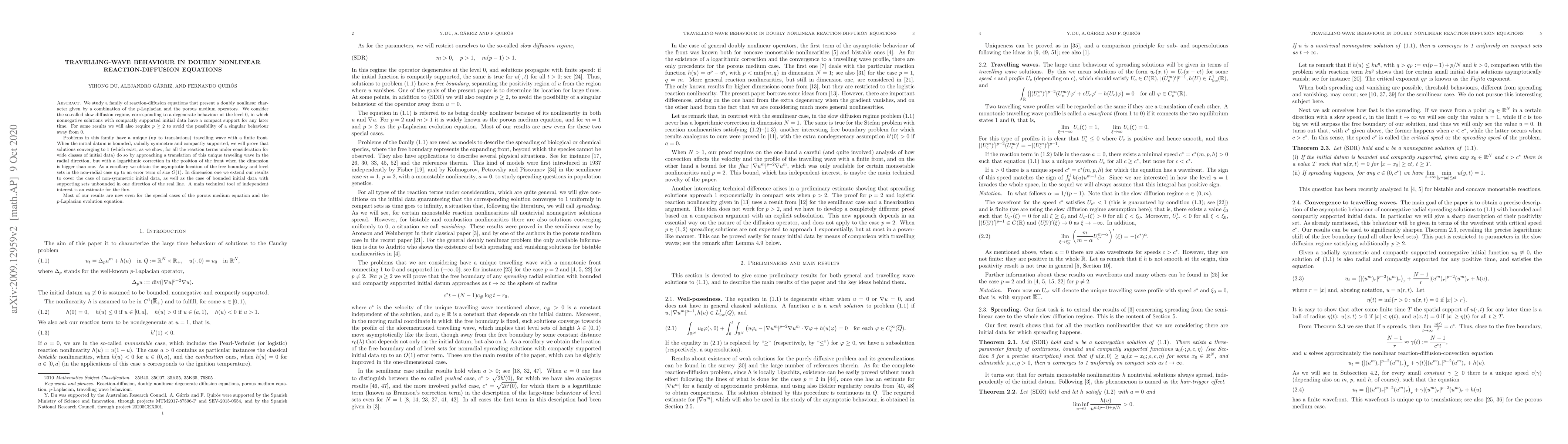 We study a family of reaction-diffusion equations that present a doubly nonlinear character given by a combination of the $p$-Laplacian and the porous medium operators. We consider the so-called slow diffusion regime, corresponding to a degenerate behaviour at the level 0, \normalcolor in which nonnegative solutions with compactly supported initial data have a compact support for any later time. For some results we will also require $p\ge2$ to avoid the possibility of a singular behaviour away from 0. Problems in this family have a unique (up to translations) travelling wave with a finite front. When the initial datum is bounded, radially symmetric and compactly supported, we will prove that solutions converging to 1 (which exist, as we show, for all the reaction terms under consideration for wide classes of initial data) do so by approaching a translation of this unique traveling wave in the radial direction, but with a logarithmic correction in the position of the front when the dimension is bigger than one. As a corollary we obtain the asymptotic location of the free boundary and level sets in the non-radial case up to an error term of size $O(1)$. In dimension one we extend our results to cover the case of non-symmetric initial data, as well as the case of bounded initial data with supporting sets unbounded in one direction of the real line. A main technical tool of independent interest is an estimate for the flux. Most of our results are new even for the special cases of the porous medium equation and the $p$-Laplacian evolution equation.