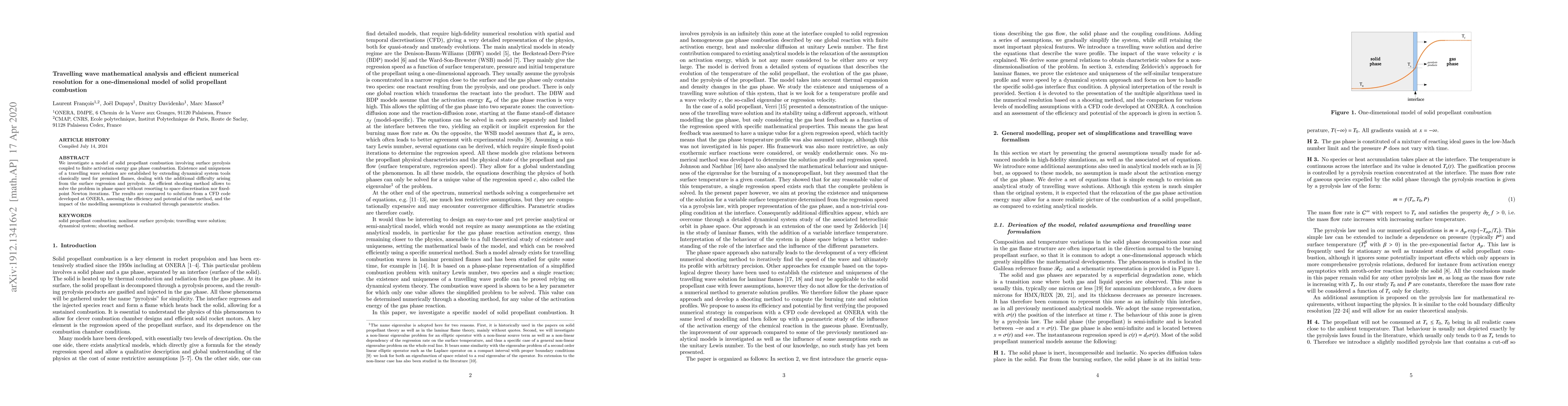 The research paper presents a mathematical analysis and efficient numerical resolution for a one-dimensional solid propellant combustion model. It establishes the existence and uniqueness of a traveling wave solution, extending dynamical system tools for premixed flames to address surface regression and pyrolysis. The study also introduces an efficient shooting method for solving the problem, which outperforms traditional space discretization and fixed-point Newton iterations. The method's efficiency is validated by comparing its results with a CFD code, and parametric studies evaluate the impact of modeling assumptions.