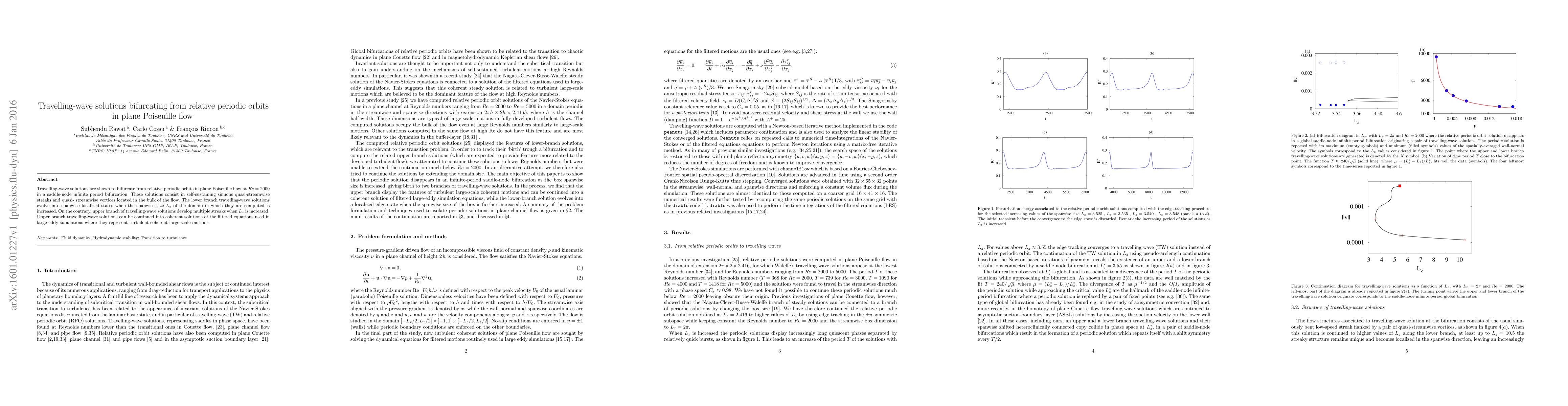 This paper investigates the bifurcation of travelling-wave solutions from relative periodic orbits in plane Poiseuille flow at Re = 2000, revealing self-sustaining sinuous streaks and vortices. The upper branch evolves into turbulent coherent large-scale motions, while the lower branch transitions to spanwise localized states with increasing domain size.