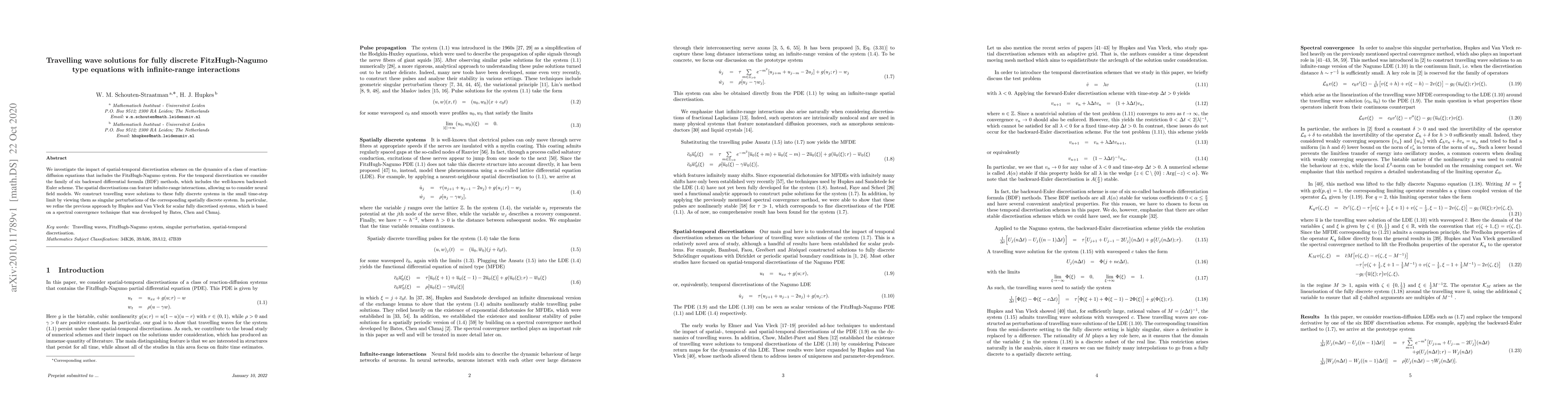 This paper examines the effects of spatial-temporal discretisation on reaction-diffusion equations, including the FitzHugh-Nagumo system, using BDF methods for temporal discretisation and infinite-range interactions for spatial discretisation. The authors construct travelling wave solutions in the small time-step limit, refining a previous approach based on spectral convergence techniques.