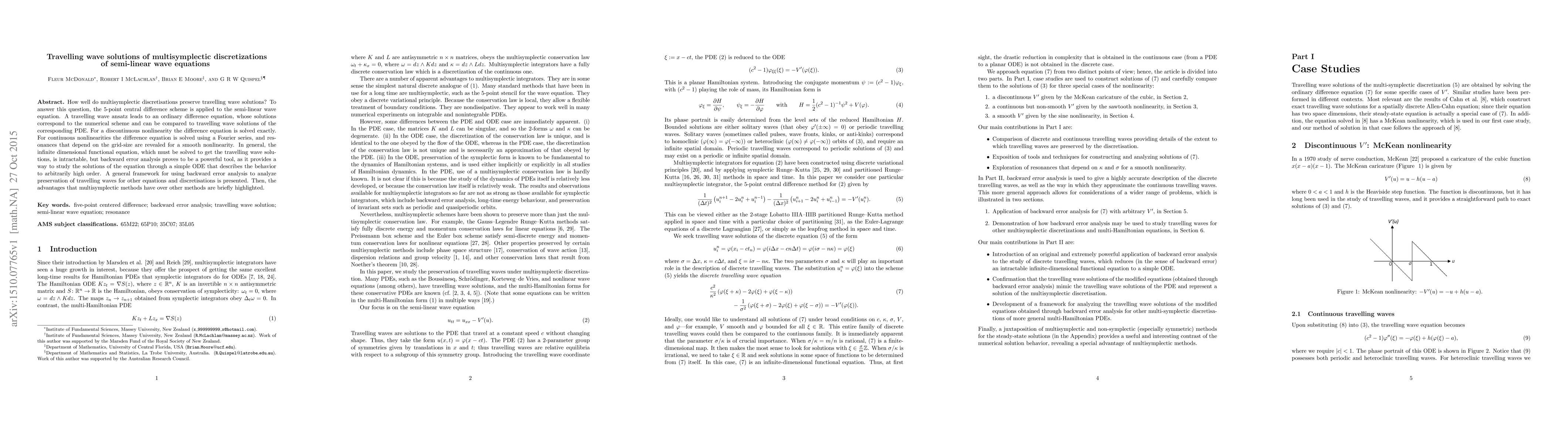 This paper investigates how multisymplectic discretisations preserve travelling wave solutions of semi-linear wave equations using the 5-point central difference scheme. It reveals resonances for smooth nonlinearities and presents a general framework for backward error analysis to study these solutions.
