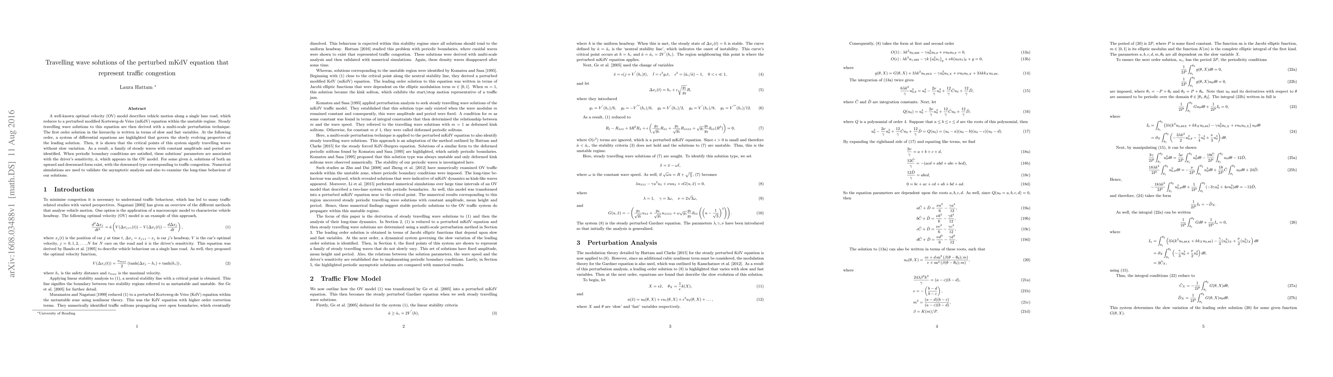 A well-known optimal velocity (OV) model describes vehicle motion along a single lane road, which reduces to a perturbed modified Korteweg-de Vries (mKdV) equation within the unstable regime. Steady travelling wave solutions to this equation are then derived with a multi-scale perturbation technique. The first order solution in the hierarchy is written in terms of slow and fast variables. At the following order, a system of differential equations are highlighted that govern the slowly evolving properties of the leading solution. Then, it is shown that the critical points of this system signify travelling waves without slow variation. As a result, a family of steady waves with constant amplitude and period are identified. When periodic boundary conditions are satisfied, these solutions' parameters are associated with the driver's sensitivity, $\hat{a}$, which appears in the OV model. For some given $\hat{a}$, solutions of both an upward and downward form exist, with the downward type corresponding to traffic congestion. Numerical simulations are used to validate the asymptotic analysis and also to examine the long-time behaviour of our solutions.