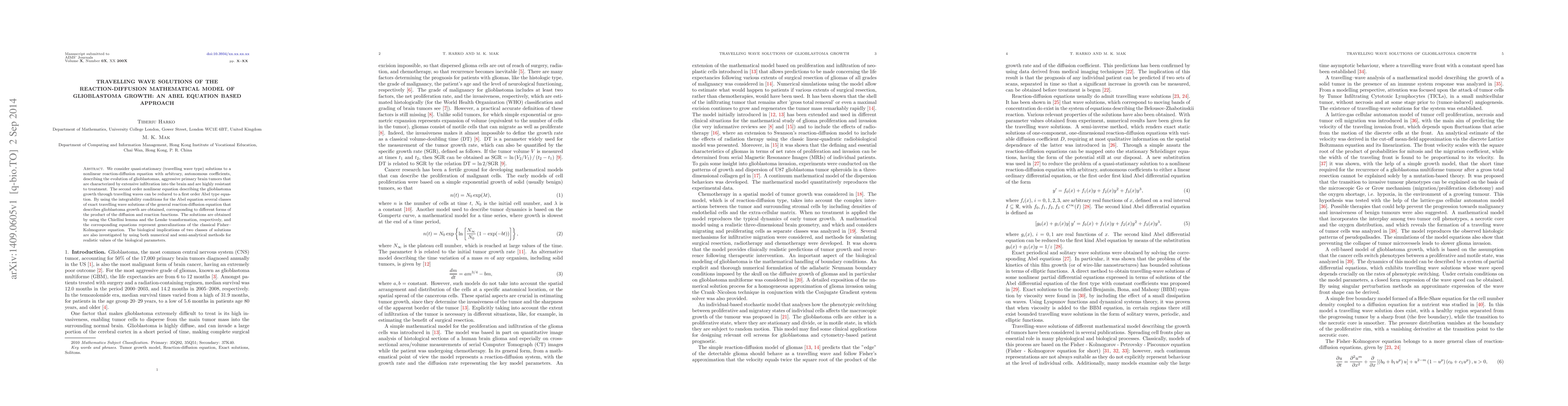 We consider quasi-stationary (travelling wave type) solutions to a nonlinear reaction-diffusion equation with arbitrary, autonomous coefficients, describing the evolution of glioblastomas, aggressive primary brain tumors that are characterized by extensive infiltration into the brain and are highly resistant to treatment. The second order nonlinear equation describing the glioblastoma growth through travelling waves can be reduced to a first order Abel type equation. By using the integrability conditions for the Abel equation several classes of exact travelling wave solutions of the general reaction-diffusion equation that describes glioblastoma growth are obtained, corresponding to different forms of the product of the diffusion and reaction functions. The solutions are obtained by using the Chiellini lemma and the Lemke transformation, respectively, and the corresponding equations represent generalizations of the classical Fisher--Kolmogorov equation. The biological implications of two classes of solutions are also investigated by using both numerical and semi-analytical methods for realistic values of the biological parameters.