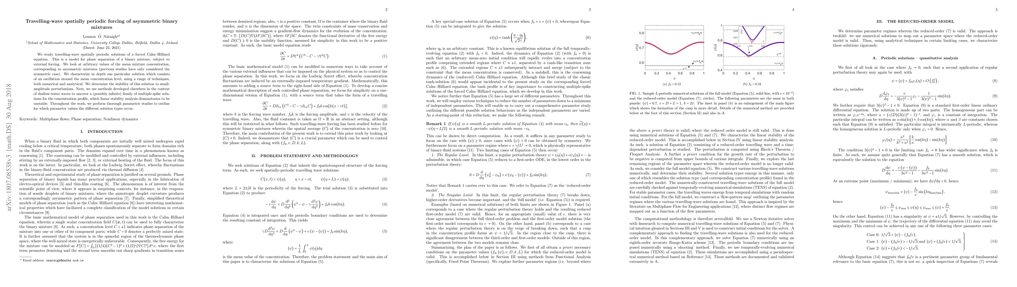 Researchers studied traveling-wave patterns in a binary mixture under external forcing, focusing on asymmetric mixtures, and found multiple solution types with varying stabilities.