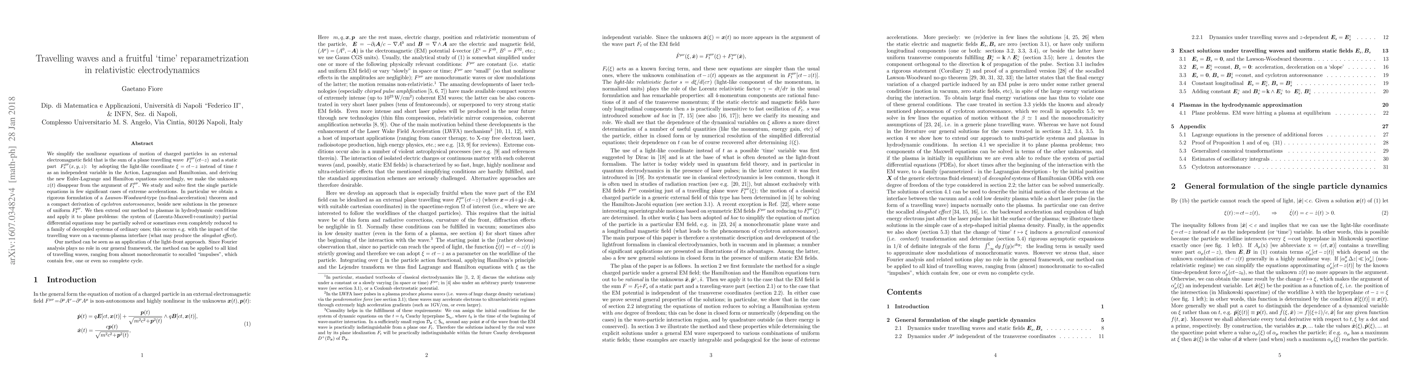 We simplify the nonlinear equations of motion of charged particles in an external electromagnetic field that is the sum of a plane travelling wave F_t(ct-z) and a static part F_s(x,y,z): by adopting the light-like coordinate ct-z instead of time t as an independent variable in the Action, Lagrangian and Hamiltonian, and deriving the new Euler-Lagrange and Hamilton equations accordingly, we make the unknown z(t) disappear from the argument of F_t. We study and solve first the single particle equations in few significant cases of extreme accelerations. In particular we obtain a rigorous formulation of a Lawson-Woodward-type (no-final-acceleration) theorem and a compact derivation of cyclotron autoresonance, beside new solutions in the presence of uniform F_s. We then extend our method to plasmas in hydrodynamic conditions and apply it to plane problems: the system of partial differential equations may be partially solved and sometimes even completely reduced to a family of decoupled systems of ordinary ones; this occurs e.g. with the impact of the travelling wave on a vacuum-plasma interface (what may produce the slingshot effect). Since Fourier analysis plays no role in our general framework, the method can be applied to all kind of travelling waves, ranging from almost monochromatic to socalled "impulses", which contain few, one or even no complete cycle.