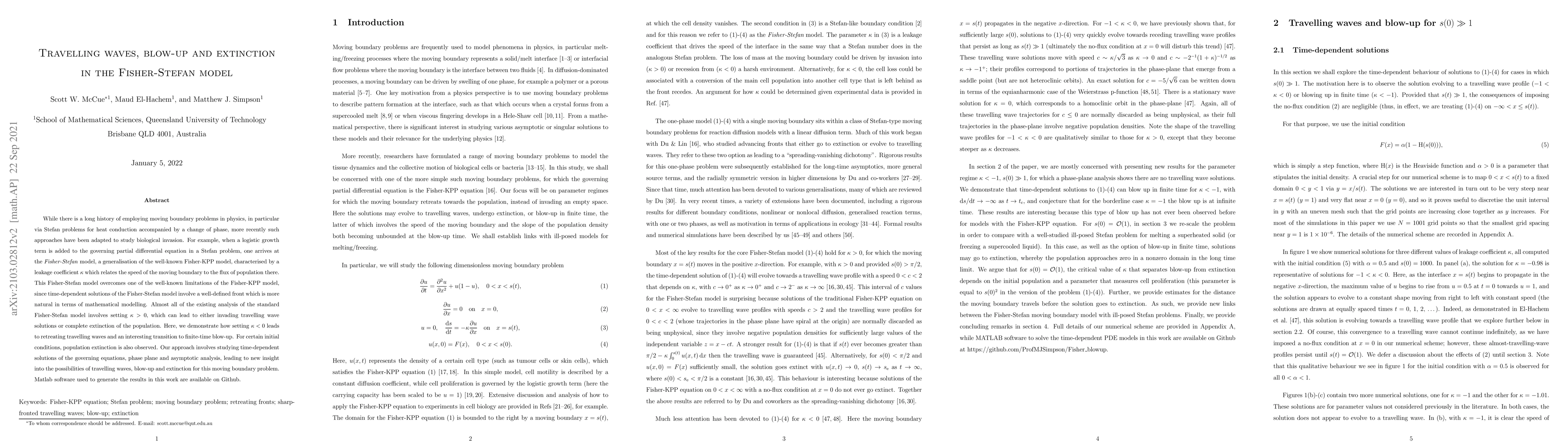 The paper presents a detailed analysis of the Fisher-Stefan model, revealing new insights into travelling waves, blow-up, and extinction phenomena in moving boundary problems.