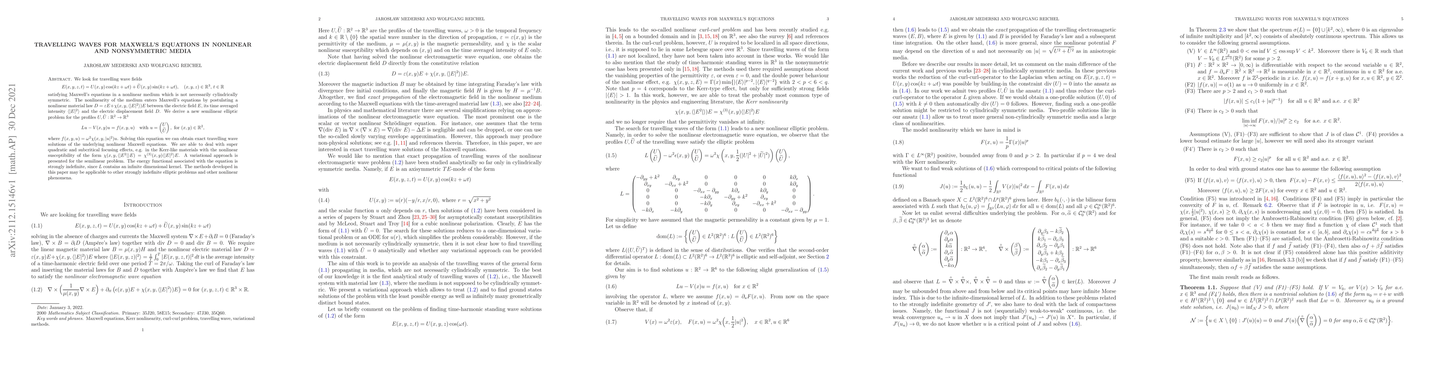 We look for travelling wave fields $$ E(x,y,z,t)= U(x,y) \cos(kz+\omega t)+ \widetilde U(x,y)\sin(kz+\omega t),\quad (x,y,z)\in\mathbb{R}^3,\, t\in\mathbb{R} $$ satisfying Maxwell's equations in a nonlinear medium which is not necessarily cylindrically symmetric. The nonlinearity of the medium enters Maxwell's equations by postulating a nonlinear material law $D=\varepsilon E+\chi(x,y, \langle |E|^2\rangle)E$ between the electric field $E$, its time averaged intensity $\langle |E|^2\rangle$ and the electric displacement field $D$. We derive a new semilinear elliptic problem for the profiles $U,\widetilde U:\mathbb{R}^2\to\mathbb{R}^3$ $$Lu-V(x,y)u=f(x,y,u)\quad\hbox{with }u=\begin{pmatrix} U \\ \widetilde U \end{pmatrix}, \hbox{ for }(x,y)\in\mathbb{R}^2,$$ where $f(x,y,u)=\omega^2\chi(x,y, |u|^2)u$. Solving this equation we can obtain exact travelling wave solutions of the underlying nonlinear Maxwell equations. We are able to deal with super quadratic and subcritical focusing effects, e.g. in the Kerr-like materials with the nonlinear susceptibility of the form $\chi(x,y,\langle |E^2|\rangle E) = \chi^{(3)}(x,y)\langle |E|^2\rangle E$. A variational approach is presented for the semilinear problem. The energy functional associated with the equation is strongly indefinite, since $L$ contains an infinite dimensional kernel. The methods developed in this paper may be applicable to other strongly indefinite elliptic problems and other nonlinear phenomena.