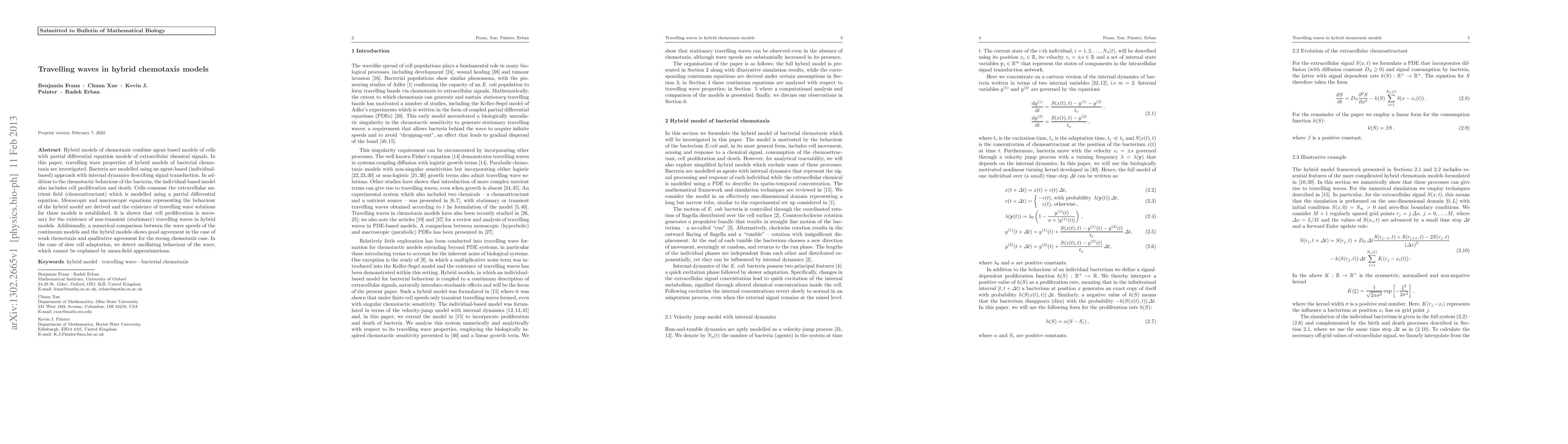 Hybrid models of chemotaxis combine agent-based models of cells with partial differential equation models of extracellular chemical signals. In this paper, travelling wave properties of hybrid models of bacterial chemotaxis are investigated. Bacteria are modelled using an agent-based (individual-based) approach with internal dynamics describing signal transduction. In addition to the chemotactic behaviour of the bacteria, the individual-based model also includes cell proliferation and death. Cells consume the extracellular nutrient field (chemoattractant) which is modelled using a partial differential equation. Mesoscopic and macroscopic equations representing the behaviour of the hybrid model are derived and the existence of travelling wave solutions for these models is established. It is shown that cell proliferation is necessary for the existence of non-transient (stationary) travelling waves in hybrid models. Additionally, a numerical comparison between the wave speeds of the continuum models and the hybrid models shows good agreement in the case of weak chemotaxis and qualitative agreement for the strong chemotaxis case. In the case of slow cell adaptation, we detect oscillating behaviour of the wave, which cannot be explained by mean-field approximations.