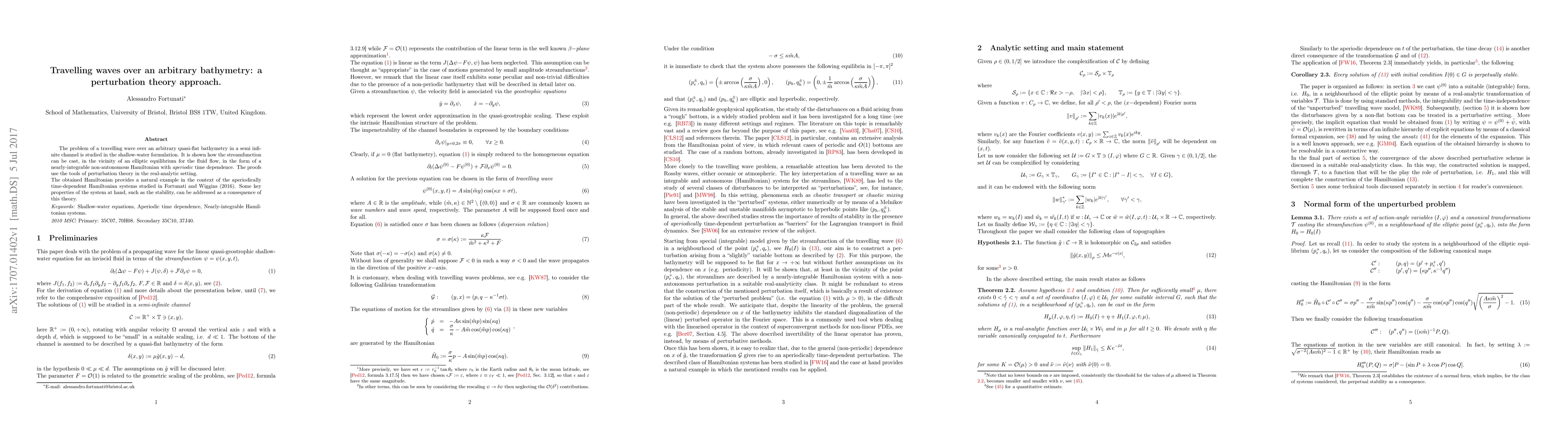 The problem of a travelling wave over an arbitrary quasi-flat bathymetry in a semi infinite channel is studied in the shallow-water formulation. It is shown how the streamfunction can be cast, in the vicinity of an elliptic equilibrium for the fluid flow, in the form of a nearly-integrable non-autonomous Hamiltonian with aperiodic time dependence. The proofs use the tools of perturbation theory in the real-analytic setting. The obtained Hamiltonian provides a natural example in the context of the aperiodically time-dependent Hamiltonian systems studied in Fortunati and Wiggins (2016). Some key properties of the system at hand, such as the stability, can be addressed as a consequence of this theory.
