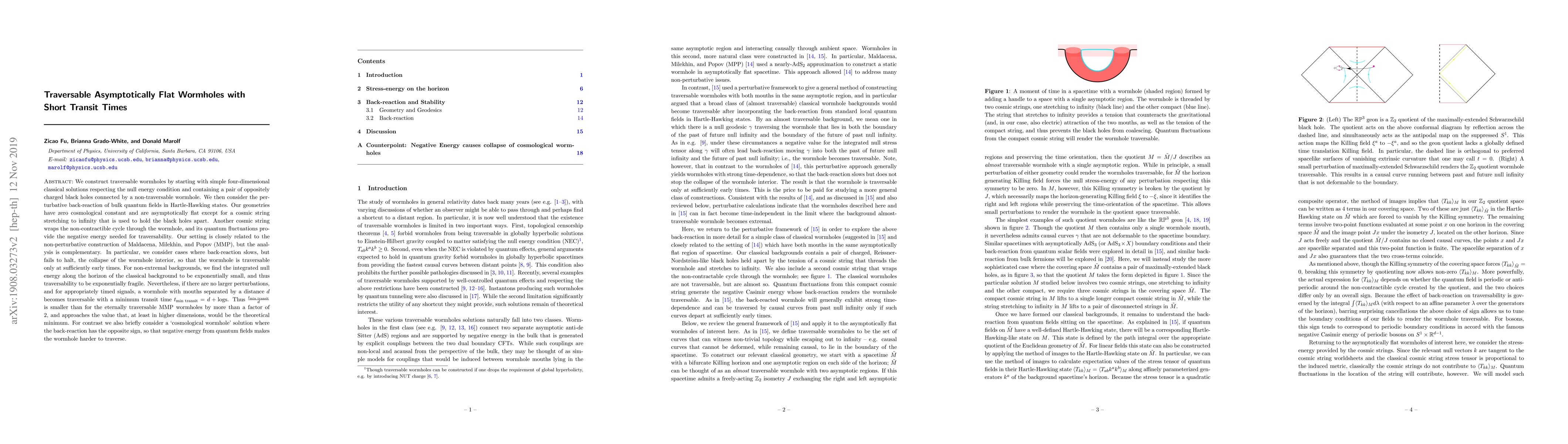 This research constructs traversable wormholes using classical solutions with charged black holes connected by a non-traversable wormhole, then incorporating quantum field back-reaction. The wormholes are asymptotically flat, held apart by cosmic strings, and become traversable due to quantum fluctuations of another cosmic string wrapping the wormhole's cycle. The study finds that while traversability is exponentially fragile, minimum transit times are significantly reduced compared to previous models, approaching theoretical minimums in certain cases.