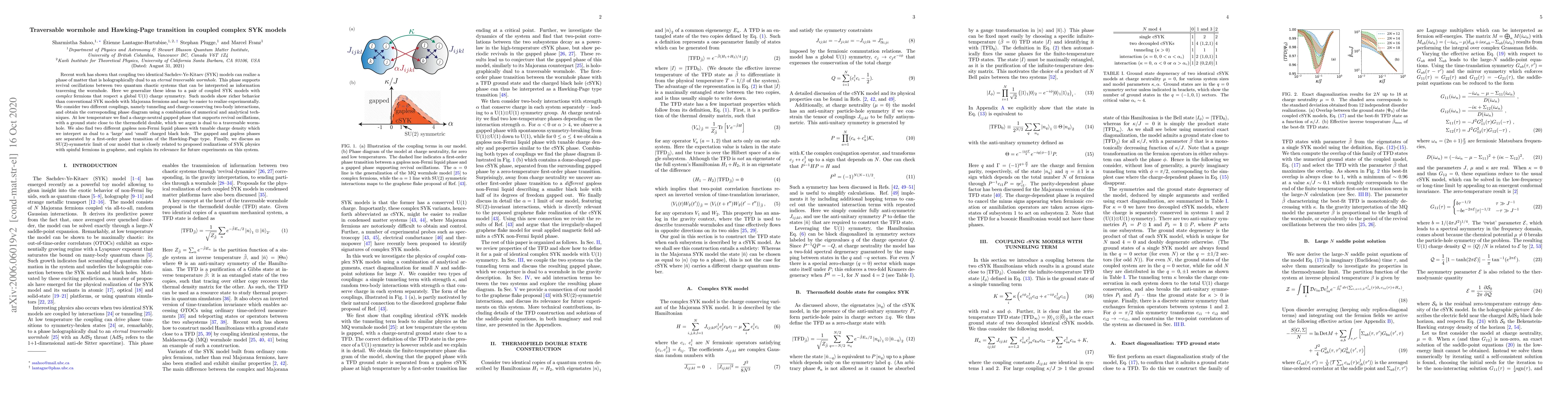 This paper explores coupled complex SYK models with U(1) charge symmetry, revealing a phase dual to a traversable wormhole and a Hawking-Page transition. It identifies a gapped phase supporting revival oscillations and two gapless non-Fermi liquid phases, separated by a first-order transition, with implications for graphene-based experimental realizations.