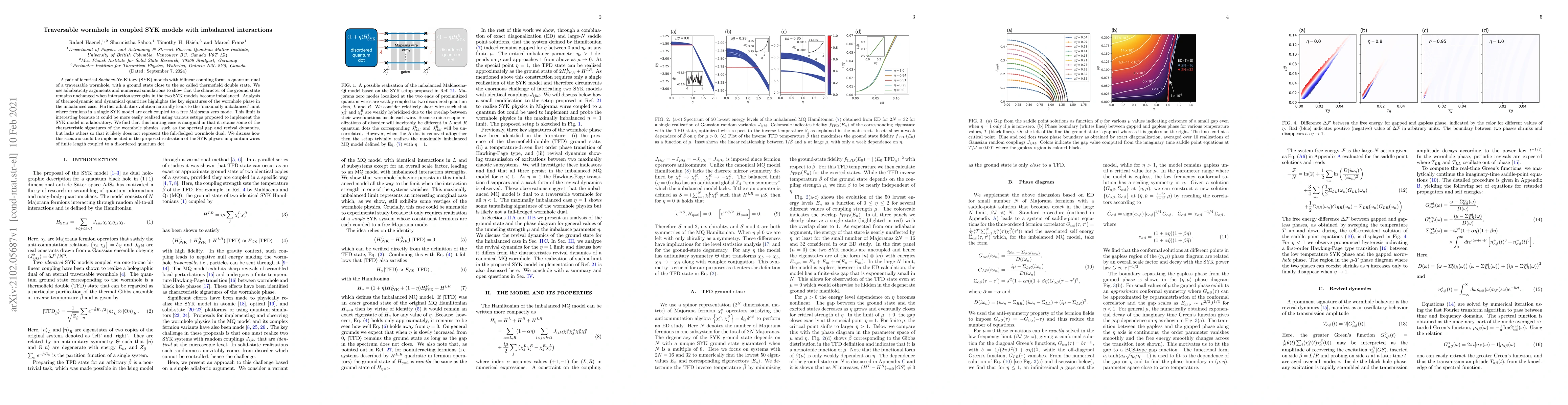 A pair of identical Sachdev-Ye-Kitaev (SYK) models with bilinear coupling forms a quantum dual of a traversable wormhole, with a ground state close to the so called thermofield double state. We use adiabaticity arguments and numerical simulations to show that the character of the ground state remains unchanged when interaction strengths in the two SYK models become imbalanced. Analysis of thermodynamic and dynamical quantities highlights the key signatures of the wormhole phase in the imbalanced case. Further adiabatic evolution naturally leads to the 'maximally imbalanced' limit where fermions in a single SYK model are each coupled to a free Majorana zero mode. This limit is interesting because it could be more easily realized using various setups proposed to implement the SYK model in a laboratory. We find that this limiting case is marginal in that it retains some of the characteristic signatures of the wormhole physics, such as the spectral gap and revival dynamics, but lacks others so that it likely does not represent the full-fledged wormhole dual. We discuss how this scenario could be implemented in the proposed realization of the SYK physics in quantum wires of finite length coupled to a disordered quantum dot.