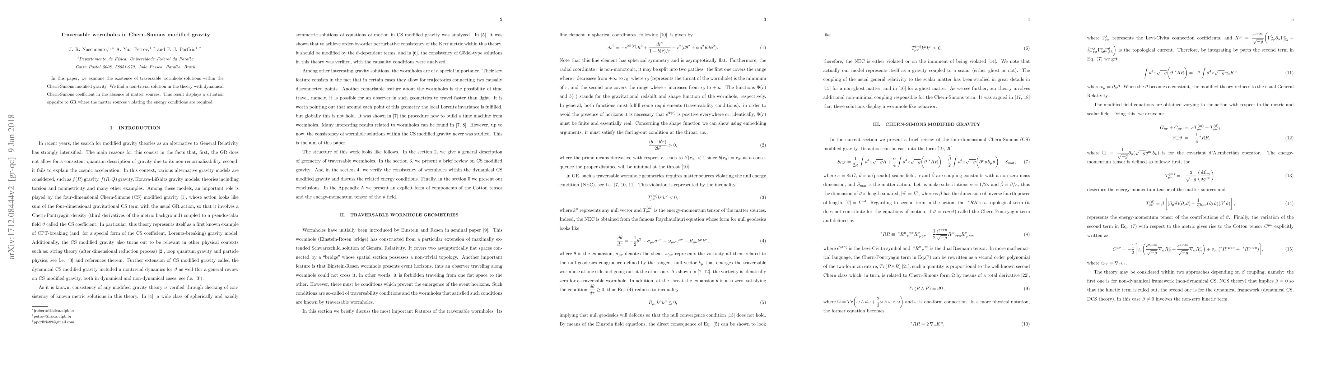 Summary: This paper explores traversable wormhole solutions in Chern-Simons modified gravity, discovering a non-trivial solution without matter sources, contrasting with general relativity's requirement of violating energy conditions for such solutions.