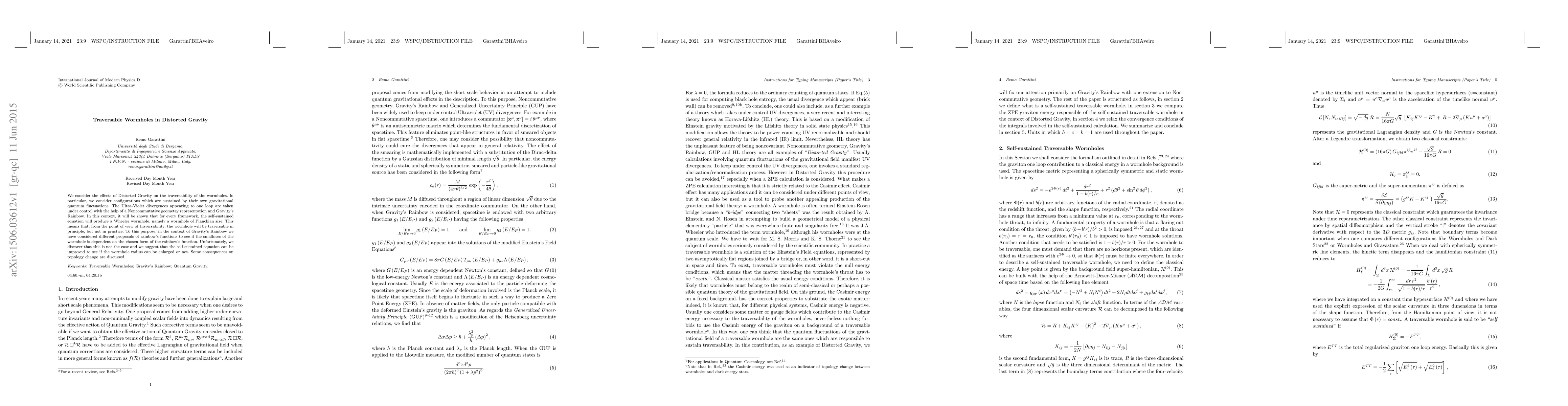 We consider the effects of Distorted Gravity on the traversability of the wormholes. In particular, we consider configurations which are sustained by their own gravitational quantum fluctuations. The Ultra-Violet divergences appearing to one loop are taken under control with the help of a Noncommutative geometry representation and Gravity's Rainbow. In this context, it will be shown that for every framework, the self-sustained equation will produce a Wheeler wormhole, namely a wormhole of Planckian size. This means that, from the point of view of traversability, the wormhole will be traversable in principle, but not in practice. To this purpose, in the context of Gravity's Rainbow we have considered different proposals of rainbow's functions to see if the smallness of the wormhole is dependent on the chosen form of the rainbow's function. Unfortunately, we discover that this is not the case and we suggest that the self-sustained equation can be improved to see if the wormhole radius can be enlarged or not. Some consequences on topology change are discussed.