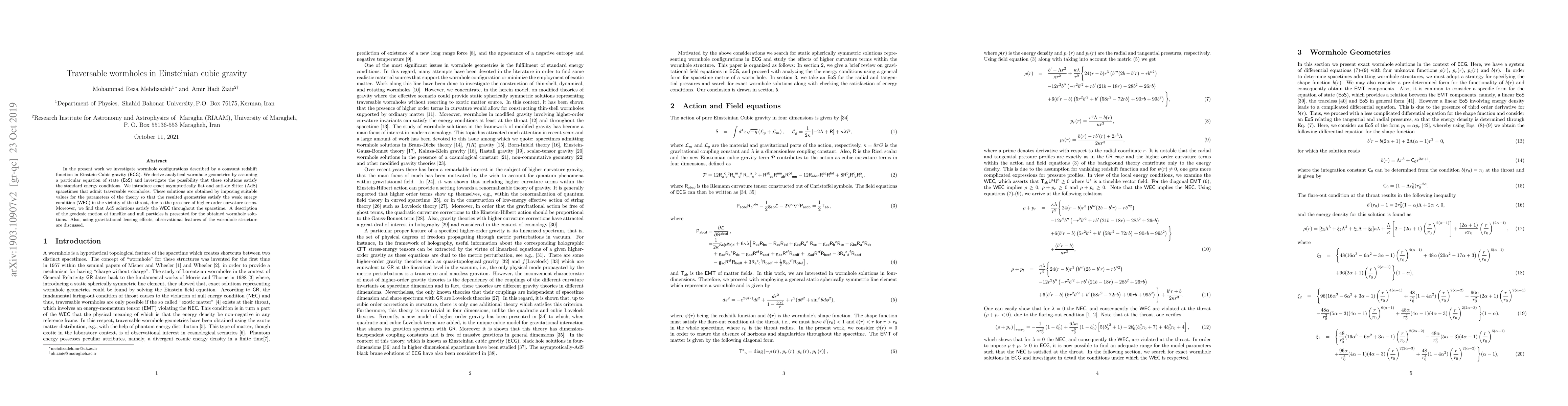 In the present work we investigate wormhole configurations described by a constant redshift function in Einstein-Cubic gravity ({{\sf ECG}}). We derive analytical wormhole geometries by assuming a particular equation of state ({{\sf EoS}}) and investigate the possibility that these solutions satisfy the standard energy conditions. We introduce exact asymptotically flat and anti-de Sitter (AdS) spacetimes that admit traversable wormholes. These solutions are obtained by imposing suitable values for the parameters of the theory so that the resulted geometries satisfy the weak energy condition ({\sf WEC}) in the vicinity of the throat, due to the presence of higher-order curvature terms. Moreover, we find that AdS solutions satisfy the {\sf WEC} throughout the spacetime. A description of the geodesic motion of timelike and null particles is presented for the obtained wormhole solutions. Also, using gravitational lensing effects, observational features of the wormhole structure are discussed.