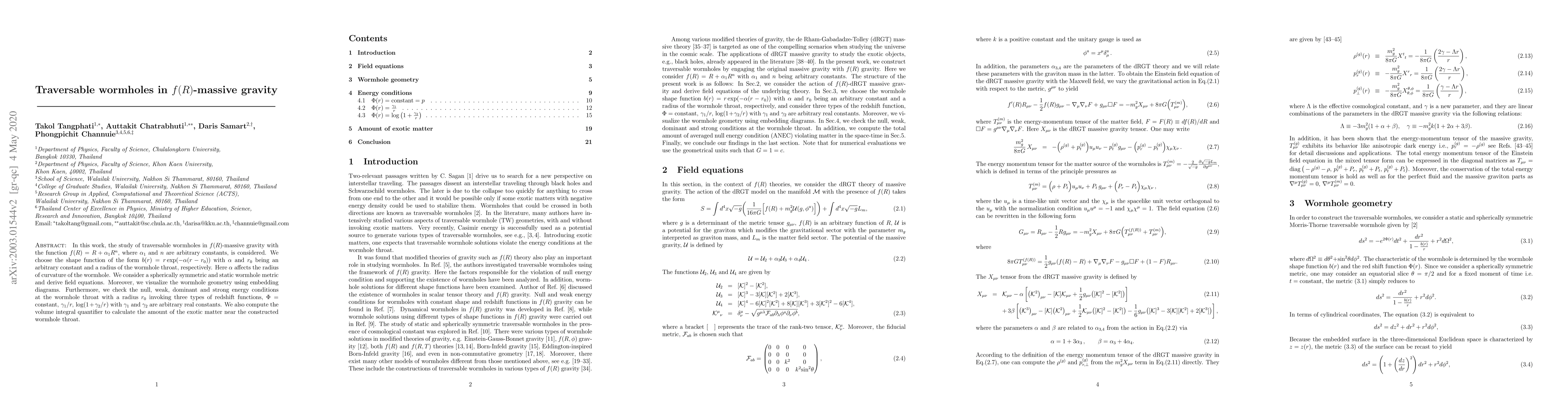 This paper investigates traversable wormholes in $f(R)$-massive gravity, deriving field equations for a spherically symmetric metric and examining energy conditions at the wormhole throat. It also computes the exotic matter volume integral and visualizes the geometry using embedding diagrams.