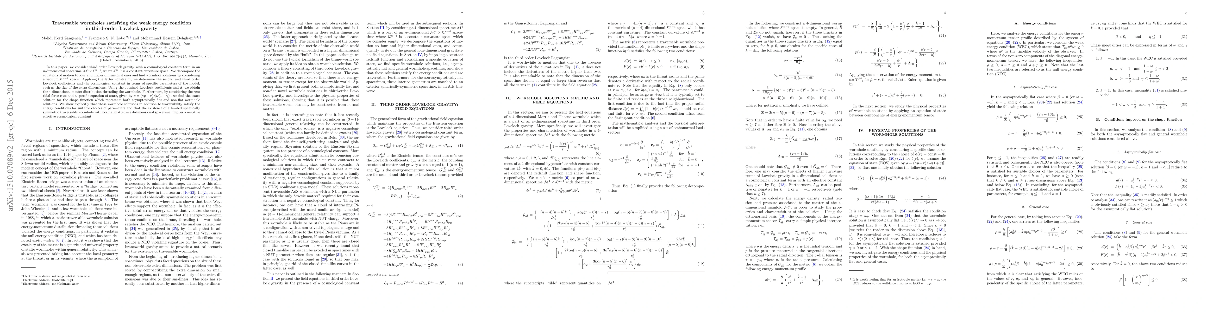 In this paper, we consider third order Lovelock gravity with a cosmological constant term in an n-dimensional spacetime $\mathcal{M}^{4}\times \mathcal{K}^{n-4}$, where $\mathcal{K}^{n-4} $ is a constant curvature space. We decompose the equations of motion to four and higher dimensional ones and find wormhole solutions by considering a vacuum $\mathcal{K}^{n-4} $ space. Applying the latter constraint, we determine the second and third order Lovelock coefficients and the cosmological constant in terms of specific parameters of the model, such as the size of the extra dimensions. Using the obtained Lovelock coefficients and $\Lambda$, we obtain the 4-dimensional matter distribution threading the wormhole. Furthermore, by considering the zero tidal force case and a specific equation of state, given by $\rho =(\gamma p-\tau )/[\omega (1+\gamma )]$, we find the exact solution for the shape function which represents both asymptotically flat and non-flat wormhole solutions. We show explicitly that these wormhole solutions in addition to traversibility satisfy the energy conditions for suitable choices of parameters and that the existence of a limited spherically symmetric traversable wormhole with normal matter in a 4-dimensional spacetime, implies a negative effective cosmological constant.