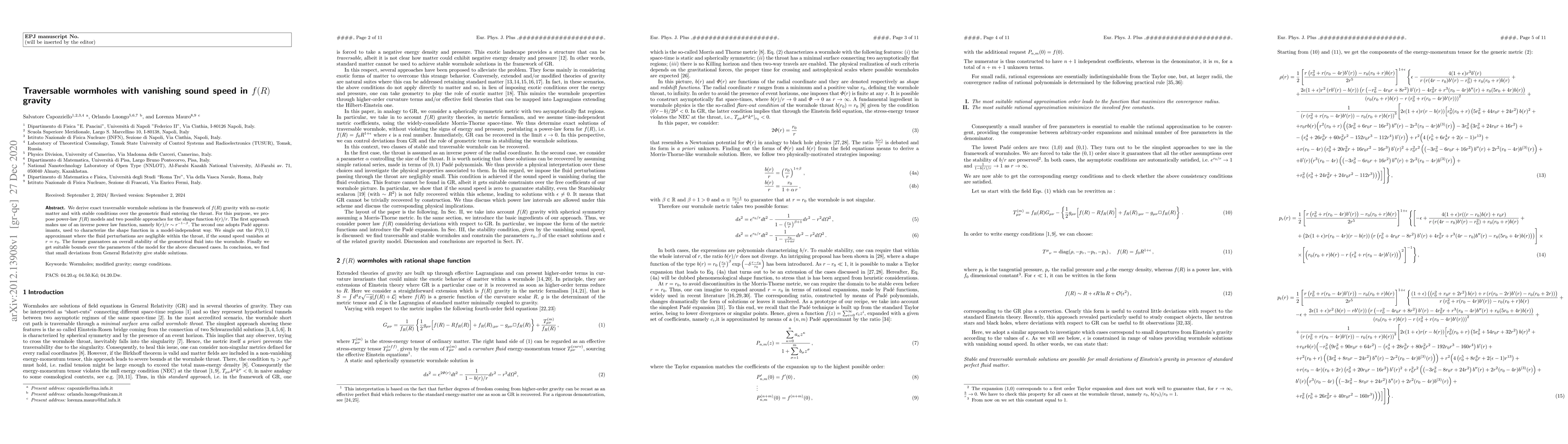 This research presents exact traversable wormhole solutions in $f(R)$ gravity, free of exotic matter and stable. It utilizes power-law $f(R)$ models and shape functions, focusing on $b(r)/rsim r^{-1-eta}$ and Padé approximants. The $P(0,1)$ approximant ensures negligible fluid perturbations and vanishing sound speed within the throat, guaranteeing overall stability. The study finds that minor deviations from General Relativity yield stable wormhole solutions.
