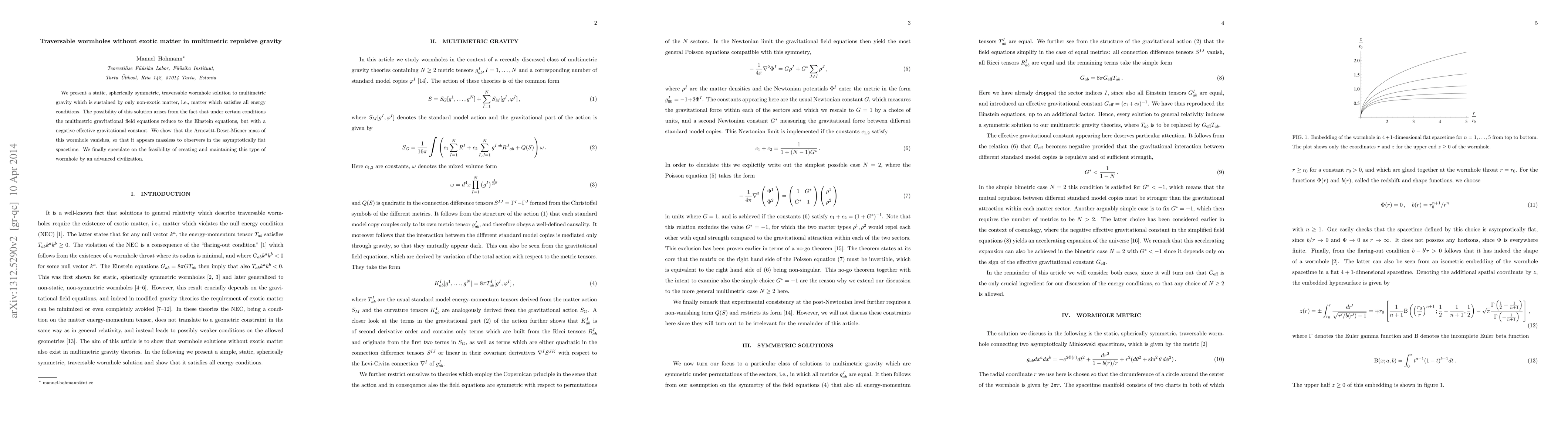 We present a static, spherically symmetric, traversable wormhole solution to multimetric gravity which is sustained by only non-exotic matter, i.e., matter which satisfies all energy conditions. The possibility of this solution arises from the fact that under certain conditions the multimetric gravitational field equations reduce to the Einstein equations, but with a negative effective gravitational constant. We show that the Arnowitt-Deser-Misner mass of this wormhole vanishes, so that it appears massless to observers in the asymptotically flat spacetime. We finally speculate on the feasibility of creating and maintaining this type of wormhole by an advanced civilization.