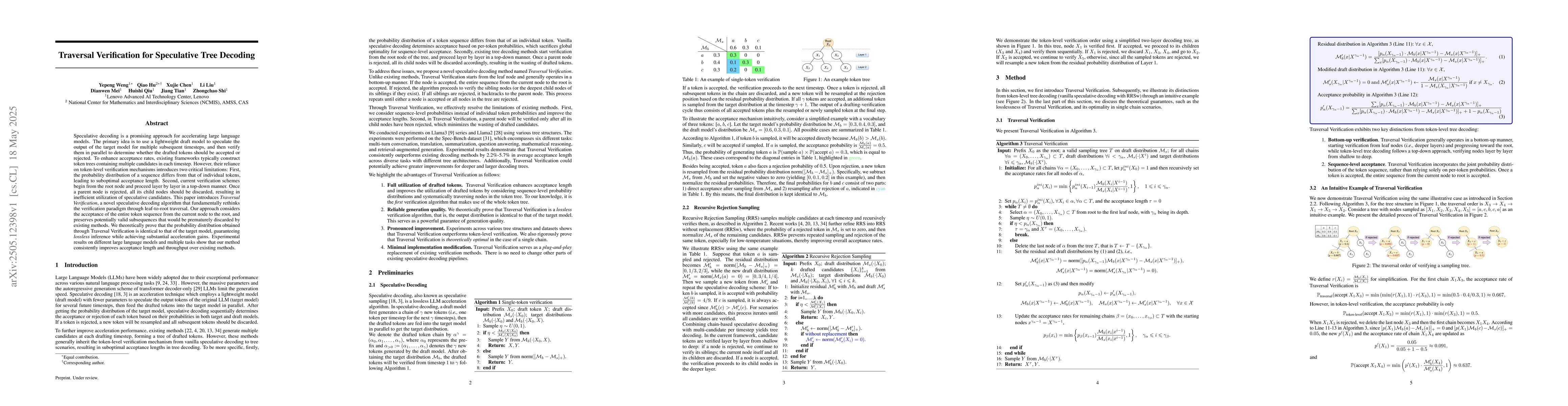 This paper introduces Traversal Verification, a new speculative decoding algorithm that improves acceptance length and throughput in large language models by considering the entire token sequence from leaf to root, ensuring lossless inference with substantial acceleration gains.