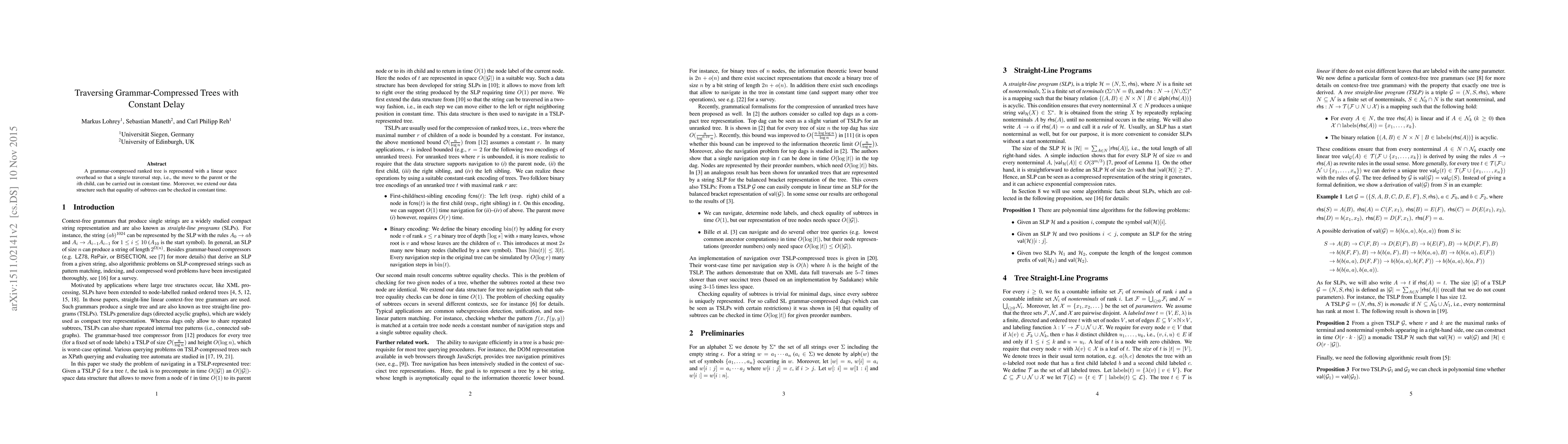 A grammar-compressed ranked tree is represented with a linear space overhead so that a single traversal step, i.e., the move to the parent or the i-th child, can be carried out in constant time. Moreover, we extend our data structure such that equality of subtrees can be checked in constant time.