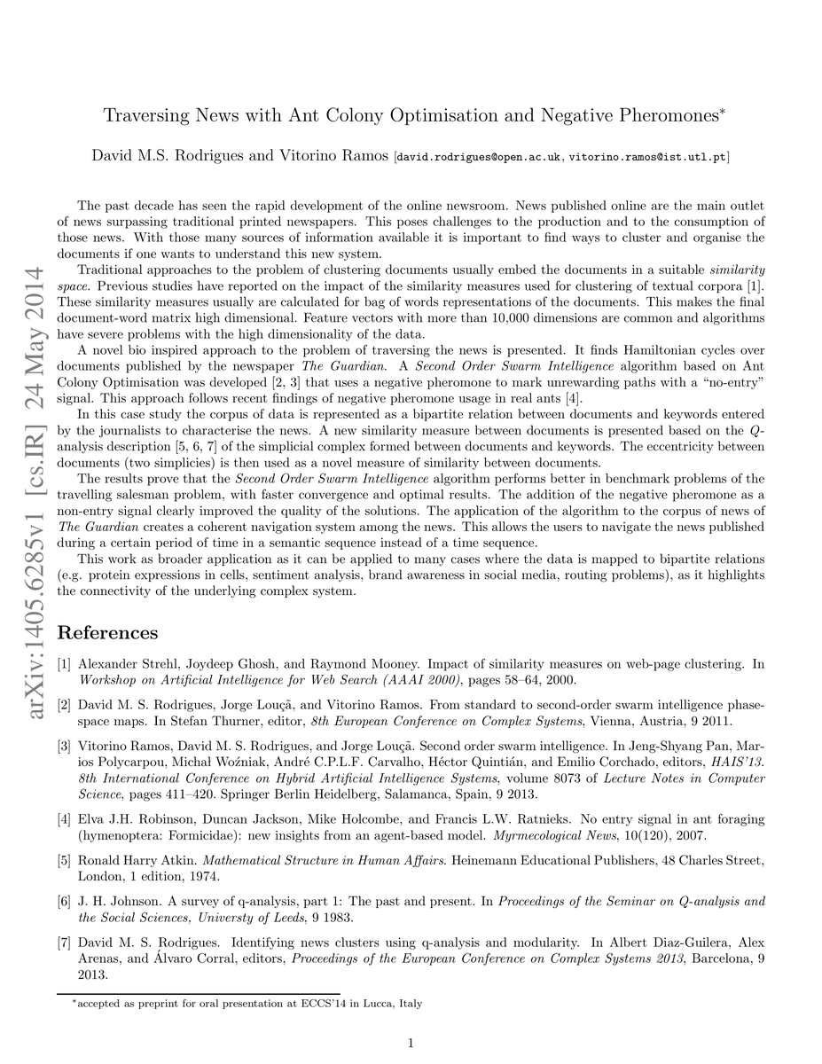 The past decade has seen the rapid development of the online newsroom. News published online are the main outlet of news surpassing traditional printed newspapers. This poses challenges to the production and to the consumption of those news. With those many sources of information available it is important to find ways to cluster and organise the documents if one wants to understand this new system. A novel bio inspired approach to the problem of traversing the news is presented. It finds Hamiltonian cycles over documents published by the newspaper The Guardian. A Second Order Swarm Intelligence algorithm based on Ant Colony Optimisation was developed that uses a negative pheromone to mark unrewarding paths with a "no-entry" signal. This approach follows recent findings of negative pheromone usage in real ants.