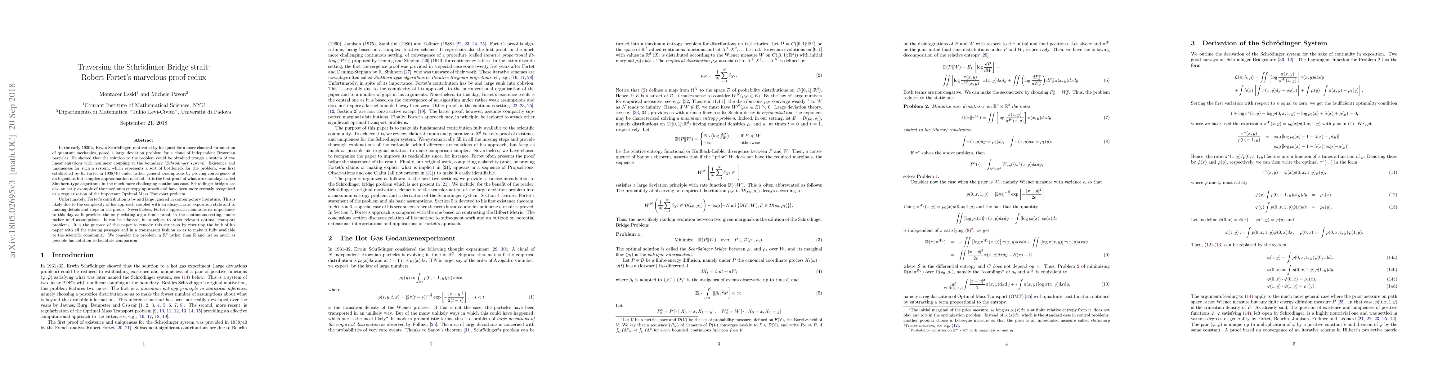 In the early 1930's, Erwin Schroedinger, motivated by his quest for a more classical formulation of quantum mechanics, posed a large deviation problem for a cloud of independent Brownian particles. He showed that the solution to the problem could be obtained trough a system of two linear equations with nonlinear coupling at the boundary (Schr\"odinger system). Existence and uniqueness for such a system, which represents a sort of bottleneck for the problem, was first established by R. Fortet in 1938/40 under rather general assumptions by proving convergence of an ingenious but complex approximation method. It is the first proof of what are nowadays called Sinkhorn-type algorithms in the much more challenging continuous case. Schr\"odinger bridges are also an early example of the maximum entropy approach and have been more recently recognized as a regularization of the important Optimal Mass Transport problem. Unfortunately, Fortet's contribution is by and large ignored in contemporary literature. This is likely due to the complexity of his approach coupled with an idiosyncratic exposition style and to missing details and steps in the proofs. Nevertheless, Fortet's approach maintains its importance to this day as it provides the only existing algorithmic proof under rather mild assumptions. It can be adapted, in principle, to other relevant problems such as the regularized Wasserstein barycenter problem. It is the purpose of this paper to remedy this situation by rewriting the bulk of his paper with all the missing passages and in a transparent fashion so as to make it fully available to the scientific community. We consider the problem in $R^d$ rather than $R$ and use as much as possible his notation to facilitate comparison.