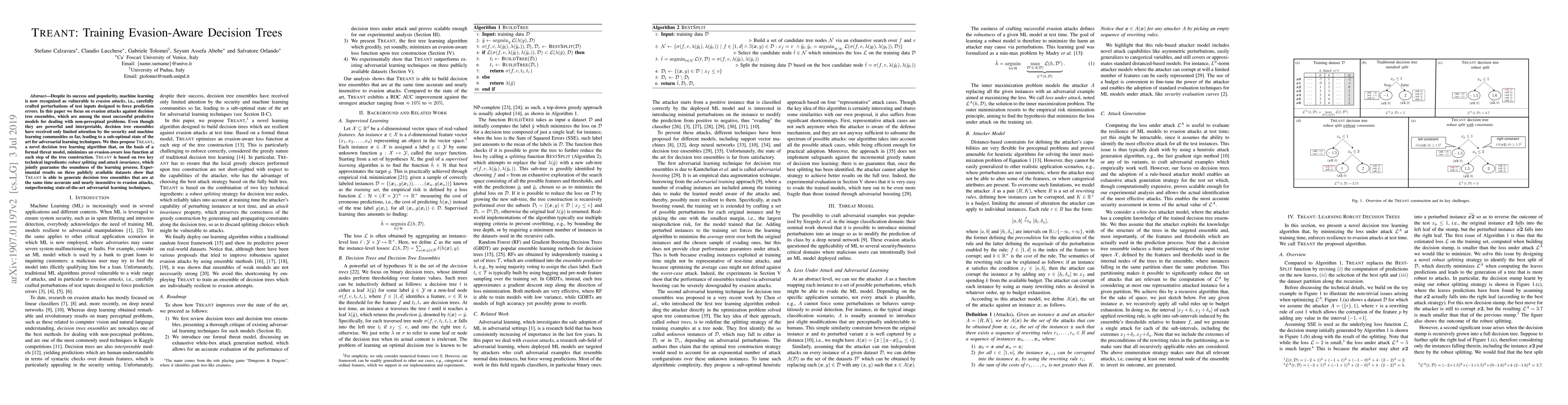 This paper introduces Treant, a novel decision tree learning algorithm designed to minimize evasion attacks by incorporating robust splitting and attack invariance during tree construction. Experimental results demonstrate that Treant effectively balances accuracy and robustness against adversarial perturbations, outperforming existing techniques.
