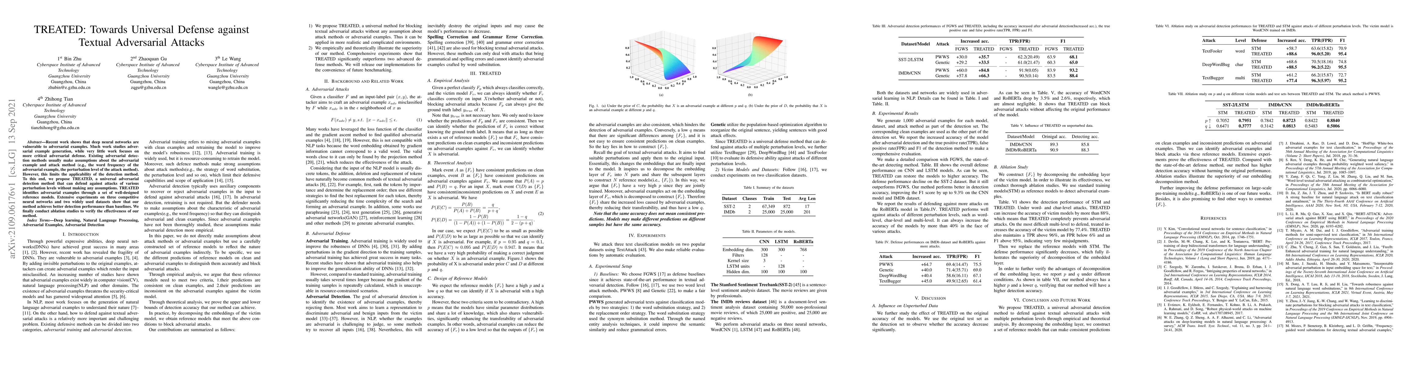 Recent work shows that deep neural networks are vulnerable to adversarial examples. Much work studies adversarial example generation, while very little work focuses on more critical adversarial defense. Existing adversarial detection methods usually make assumptions about the adversarial example and attack method (e.g., the word frequency of the adversarial example, the perturbation level of the attack method). However, this limits the applicability of the detection method. To this end, we propose TREATED, a universal adversarial detection method that can defend against attacks of various perturbation levels without making any assumptions. TREATED identifies adversarial examples through a set of well-designed reference models. Extensive experiments on three competitive neural networks and two widely used datasets show that our method achieves better detection performance than baselines. We finally conduct ablation studies to verify the effectiveness of our method.